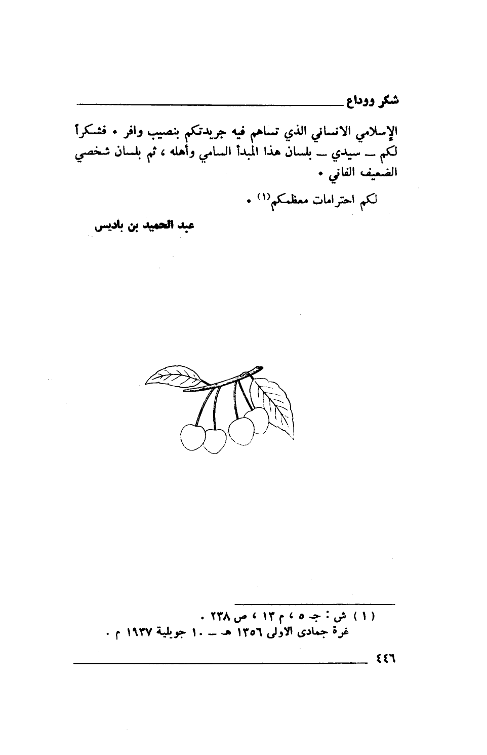 (1) ش: ج 5، م 13، ص 238. غرة جمادى الأولى 1356هـ - 10 جويلية 1937م.
