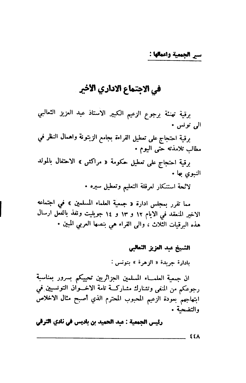 إن جمعية العلماء المسلمين الجزائريين تحييكم بسرور بمناسبة رجوعكم من المنفى وتشارك مشاركة تامة الإخوان التونسيين في ابتهاجهم بعودة الزعيم المحبوب المحترم الذي أصبح مثال الإخلاص والتضحية.
