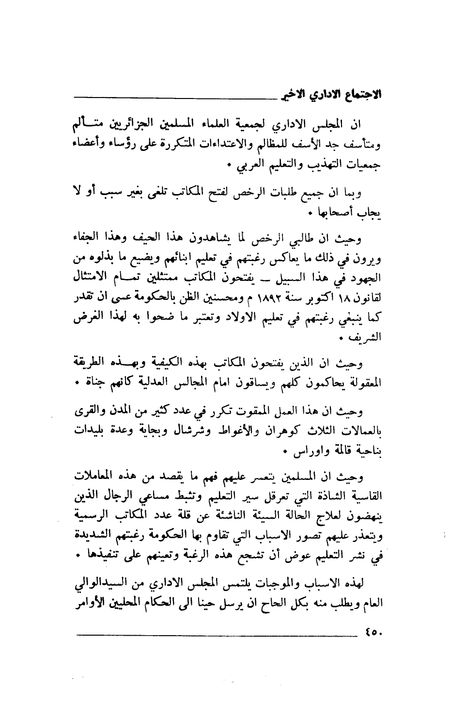 إن المجلس الإداري لجمعية العلماء المسلمين الجزائريين متألم ومتأسف حد الأسف للمظالم والاعتداءات المتكررة على رؤساء وأعضاء جمعيات التهذيب والتعليم العربي.