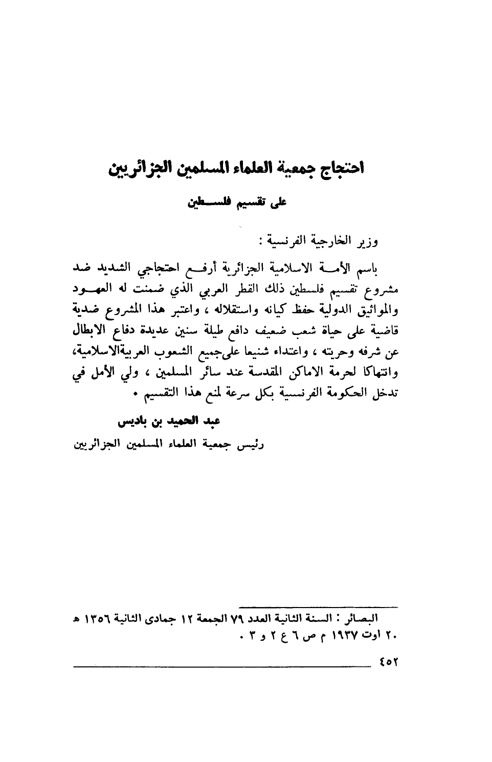 باسم الأمة الإسلمية الجزائرية أرفع احتجاجي الشديد ضد مشروع تقسيم فلسطين ذلك القطر العربي الذي ضمنت له العهود والمواثيق الدولية حفظ كيانه واستقلاله، واعتبر هذا المشروع ضدية قاضية على حياة شعب ضعيف دافع طيلة سنين عديدة دفاع الأبطال عن شرفه وحريته، واعتداء شنيعا على جميع الشعوب العربية الإسلامية، وانتهاكا لحرمة الأماكن المقدسة عند سائر المسلمين، ولي الأمل في تدخل الحكومة الفرنسية بكل سرعة لمنع هذا التقسيم.