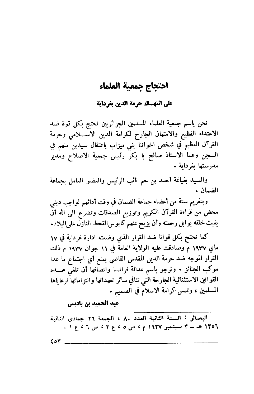 البصائر: السنة الثانية العدد 80، الجمعة 26 جمادى الثانية 1356هـ - 3 سبتمبر 1937م، ص 5، ع 3، ص 6، ع 1.