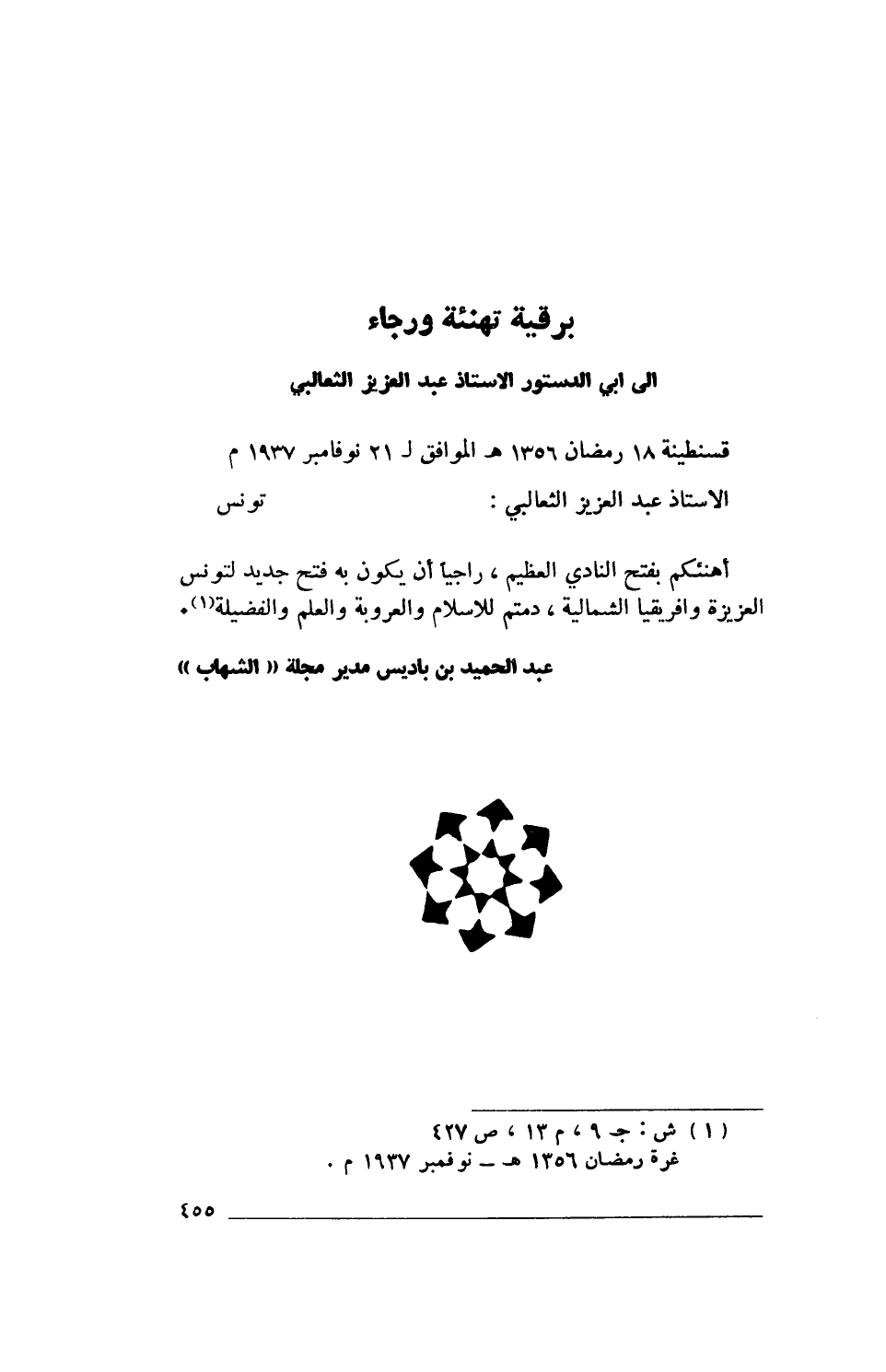 قسنطينة 18 رمضان 1356هـ الموافق لـ 21 نوفامبر 1937م الأستاذ عبد العزيز الثعالبي: تونس
