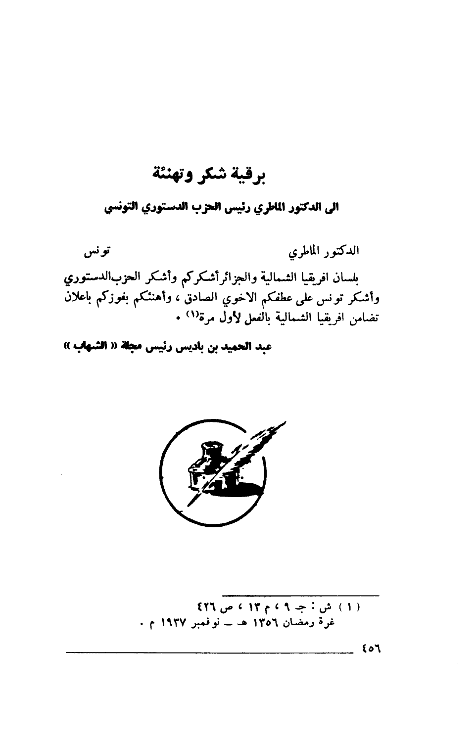 (1) ش: ج 9، م 13، ص 426 غرة رمضان 1356هـ - نوفمبر 1937م.