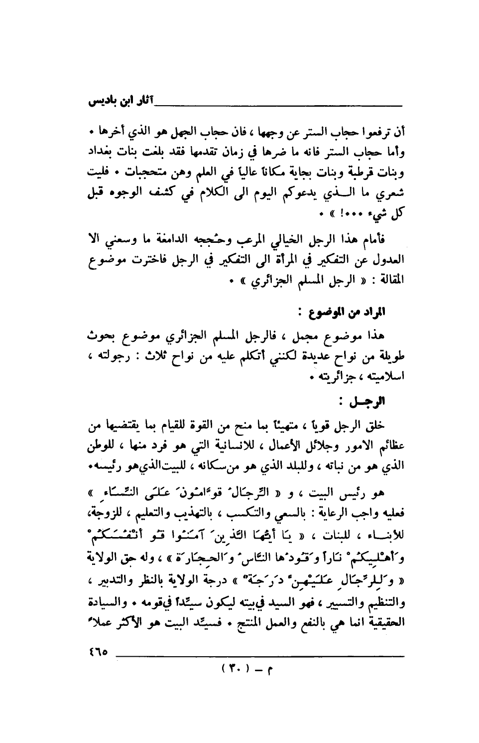 هذا موضوع مجمل، فالرجل المسلم الجزائري موضوع بحوث طويلة من نواح عديدة لكنني أتكلم عليه من نواح ثلاث: رجولته، إسلاميته، جزائريته.
