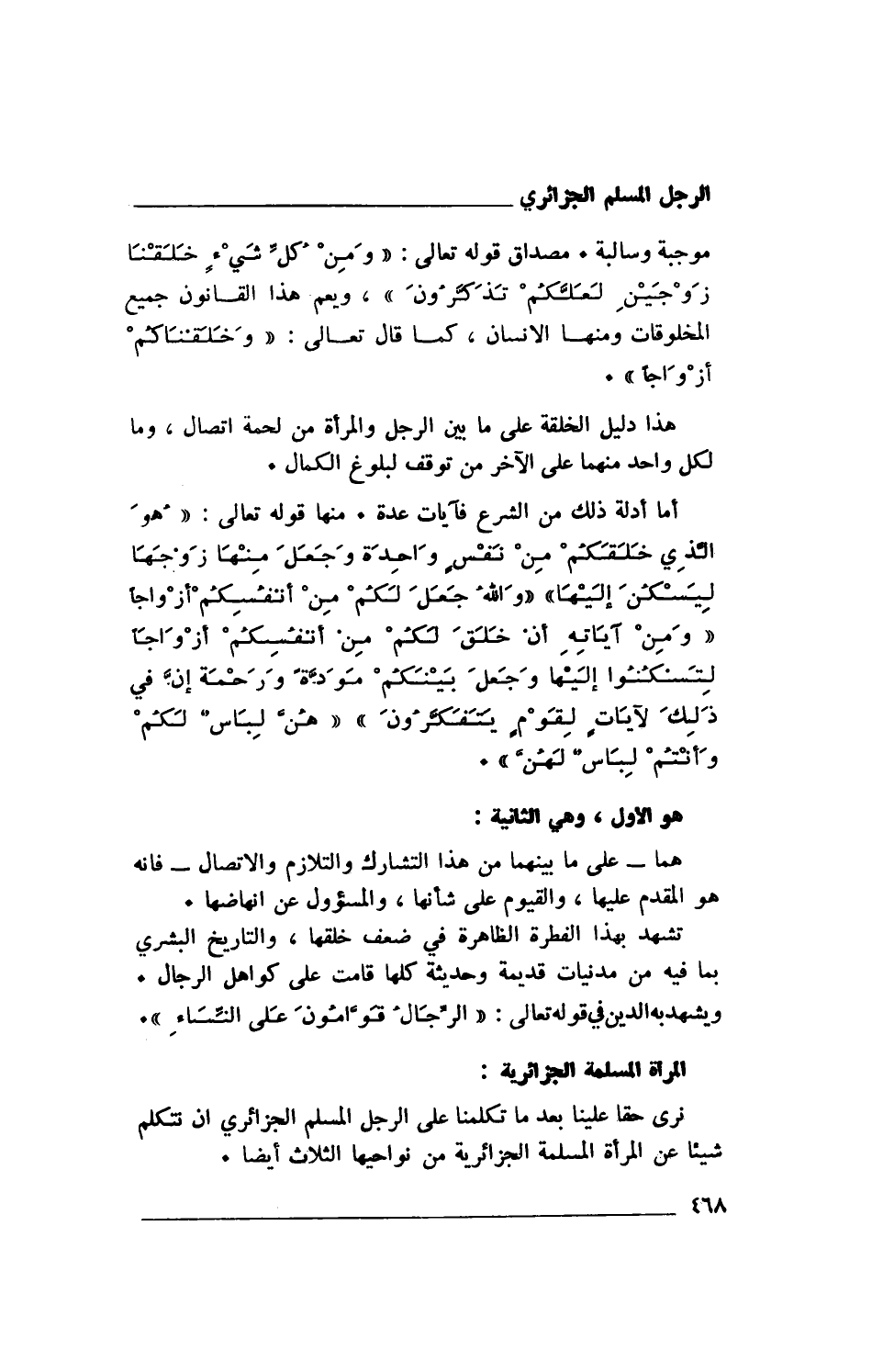 نرى حقا علينا بعد ما تكلمنا على الرجل المسلم الجزائري أن نتكلم شيئا عن المرأة المسلمة الجزائرية من نواحيها الثلاث أيضا.