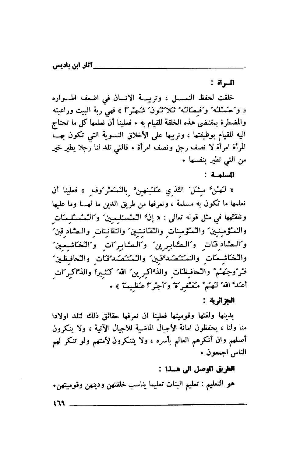 خلقت لحفظ النسل، وتربية الإنسان في أضعف أطواره {وَحَمْلُهُ وَفِصَالُهُ ثَلَاثُونَ شَهْرًا} فهي ربة البيت وراعيته والمضطرة بمقتضى هذه الخلقة للقيام به. فعلينا أن نعلمها كل ما تحتاج إليه للقيام بوظيفتها، ونربيها على الأخلاق النسوية التي تكون بها المرأة امرأة لا نصف رجل ونصف امرأة. فالتي تلد لنا رجلا يطير خير من التي تطير بنفسها.
