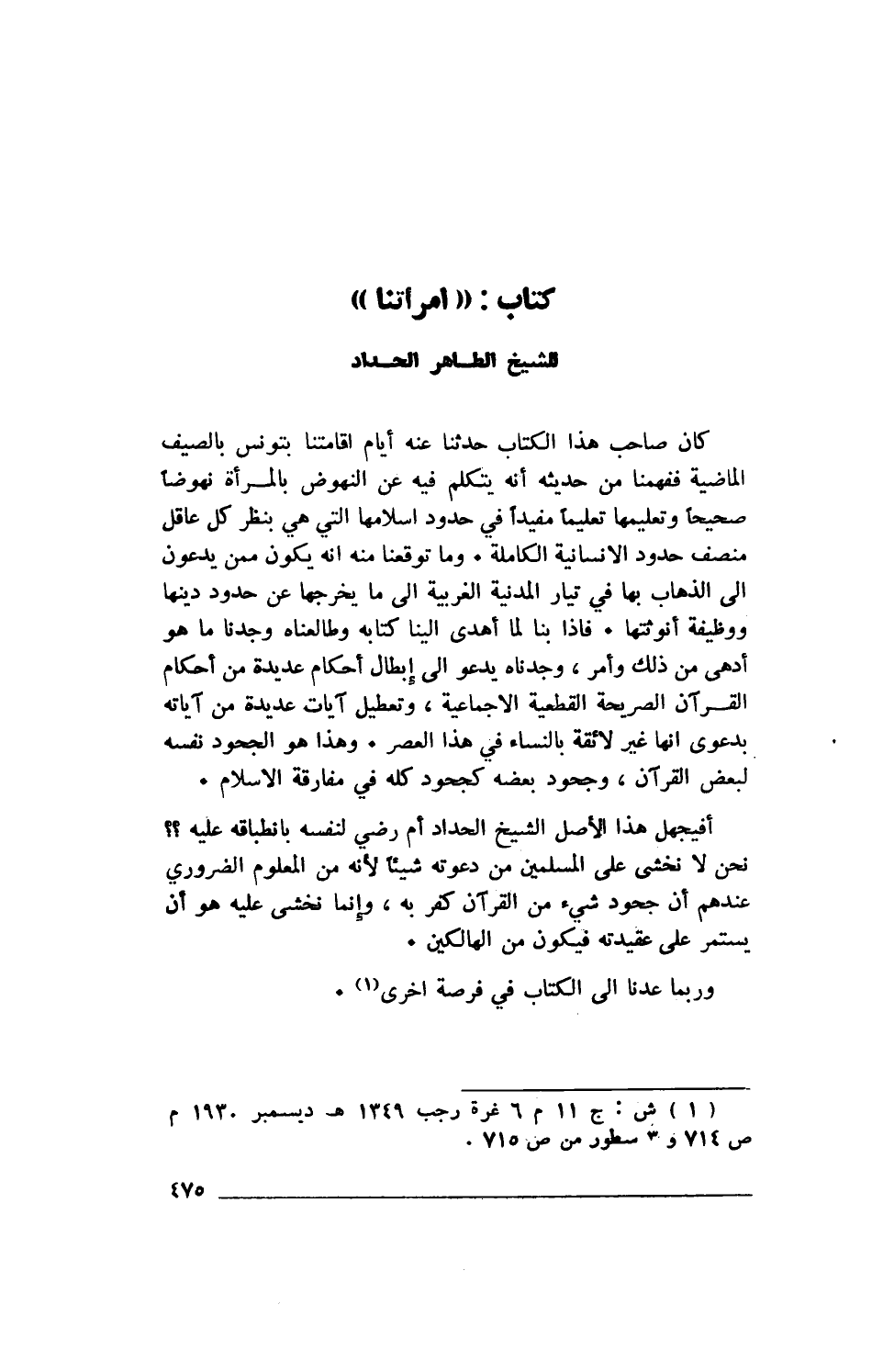 كان صاحب هذا الكتاب حدثنا عنه أيام إقامتنا بتونس بالصيف الماضية ففهمنا من حديثه أنه يتكلم فيه عن النهوض بالمرأة نهوضا صحيحا وتعليمها تعليما مفيداً في حدود إسلامها التي هي بنظر كل عاقل منصف حدود الإنسانية الكاملة. وما توقعنا منه أنه يكون ممن يدعون إلى الذهاب بها في تيار المدنية الغربية إلى ما يخرجها عن حدود دينها ووظيفة أنوثتها. فإذا بنا لما أهدى إلينا كتابه وطالعناه وجدنا ما هو أدهى من ذلك وأمر، وجدناه يدعو إلى إبطال أحكام عديدة من أحكام القرآن الصريحة القطعية الإجماعية، وتعطيل آيات عديده من آياته بدعوى أنها غير لائقة بالنساء في هذا العصر. وهذا هو الجحود نفسه لبعض القرآن، وجحود بعضه كجحود كله في مفاوقة الإسلام.