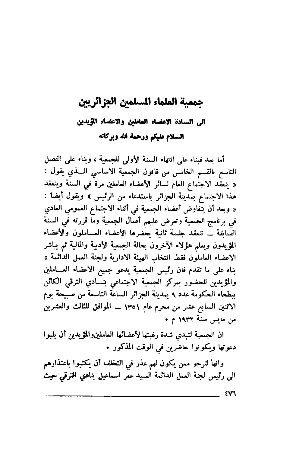 أما بعد فبناء على انتهاء السنة الأولى للجمعية، وبناء على الفصل التاسع بالقسم الخامس من قافون الجمعية الأساسي الذي يقول: "ينعقد الاجتماع العام لسائر الأعضاء العاملين مرة في السنة وينعقد هذا الاجتماع بمدينة الجزائر باستدعاء من الرئيس" ويقول أيضا: "وبعد أن يتفاوض أعضاء الجمعية في أثناء الإجتماع العمومي العادي في برنامج الجمعية وتعرض عليهم أعمال الجمعية وما قررته في السنة السبقة- تنعقد جلسة ثانية يحضرها الأعضاء العاملون والأعضاء المؤيدون ويعلم هؤلاء الآخرون بحالة الجمعية الأدبية والمالية ثم يباشر الأعضاء العاملون فقط انتخاب الهيئة الإدارية ولجنة العمل الدائمة" بنإء على ما تقدم فإن رئيس الجمعية يدعو جميع الأعضاء العاملين والمؤيدين للحضور بمركز الجمعية الاجتماعي بنادي الترقي الكائن ببطحاء الحكومه عدد 9 بمدينة الجزائر الساعة التاسعه من صبيحة يوم الإثنين السابع عشر من محرم عام 1351 - الموافق للثالث والعشرين من مايس سنة 1932م.