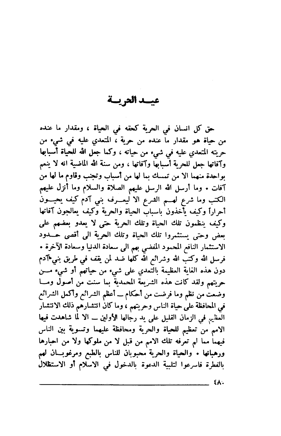 حق كل انسان في الحرية كحقه في الحياة، ومقدار ما عنده من حياة هو مقدار ما عنده من حرية، المتعدي عليه في شيء من حريته المتعدي عليه في شيء من حياته، وكما جعل الله للحياة أسبابها وآفاتها جعل للحرية أسبابها وآفاتها، ومن سنة الله الماضية أنه لا ينعم بواحدة منهما إلا من تمسك بما لها بن أسباب وتجنب وقاوم ما لها من آفات. وما أرسل الله الرسل عليهم الصلاة والسلام وما أنزل عليهم الكتب وما شرع لهم الشرع إلا ليعرف بني آدم كيف يحيون أحرارا وكيف يأخذون بأسباب الحياة والحرية وكيف يعالجون آفاتها وكيف ينظمون تلك الحياة وتلك الحرية حتى لا يعدو بعضهم على بعض وحتى يستثمروا تلك الحياة وتلك الحرية إلى أقصى حدود الاستثمار النافع المحمود المفضي بهم إلى سعادة الدنيا وسعادة الآخرة. فرسل الله وكتب الله وشرائع الله كلها ضد لمن يقف في طريق بني آدم دون هذه الغاية العظيمة بالتعدي على شيء من حياتهم أو شيء من حريتهم ولقد كانت هذه الشريعة المحمدية، بما سنت من أصول وما وضعت من نظم وما فرضت من أحكام- أعظم الشرائع وأكمل الشرائع في المحافظة على حياة الناس وحريتهم، وما كان انتشارهم ذلك الانتشار العظيم في الزمان القليل على يد رجالها الأولين- إلا لما شاهدت فيها الأمم من تعظيم للحياة والحرية ومحافظة عليهما وتسوية بين الناس فيهما مما لم تعرفه تلك الأمم من قبل لا من ملوكها ولا من أحبارها ورهبانها. والحياة والحرية محبوبان للناس بالطبع ومرغوبان لهم بالفطرة فأسرعوا لتلبية الدعوة بالدخول في الإسلام أو الإستظلال