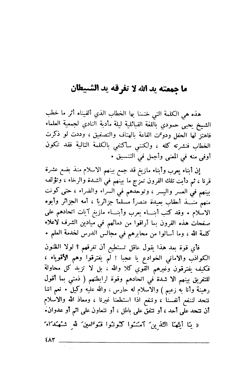 هذه هي الكلمة التي ختمنا بها الخطاب الذي ألقيناه أثر ما خطب الشيخ يحيى حمودي باللغة القبائلية ليلة مأدبة النادي لجمعية العلماء فاهتز لها الحفل ودوَّت القاعة بالهتاف والتصفيق، وددت لو ذكرت الخطاب فنشرته كله، ولكنني سأكتفي بالكلمة التالية فقد تكون أوفى منه في المعنى وأجمل في التنسيق.
