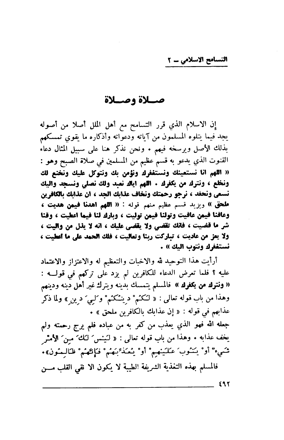 إن الإسلام الذي قرر التسامح مع أهل الملل أصلا من أصوله يجد فيما يتلوه المسلمون من آياته ودعواته وأذكاره ما يقوي تمسكهم بذلك الأصل ويرسخه فيهم. ونحن نذكر هنا على سبيل المثال دعاء القنوت الذي يدعو به قسم عظيم من المسلمين في صلاة الصبح وهو: ((اللهم إنا نستعينك ونستغفرك ونؤمن بك ونتوكل عليك ونخنع لك ونخلع، ونترك من يكفرك. اللهم إياك نعبد ولك نصلي ونسجد وإليك نسعى ونحفد، نرجو رحمتك ونخاف عذابك الجد، إن عذابك بالكافرين ملحق)) ويزيد قسم عظيم منهم قوله: ((اللهم اهدنا فيمن هديت، وعافنا فيمن عافيت وتولنا فيمن توليت، وبارك لنا فيما أعطيت، وقنا شر ما قضيت، فإنك تقضي ولا يقضى عليك، إنه لا يذل من واليت، ولا يعز من عاديت، تباركت ربنا وتعاليت، فلك الحمد على ما أعطيت، نستغفرك ونتوب إليك)).