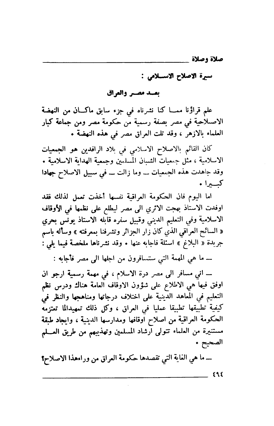 أما اليوم فإن الحكومة العراقية نفسها أخذت تعمل لذلك فقد أوفدت الأستاذ بهجت الأثري إلى مصر ليطلع على نظمها في الأوقاف الإسلامية وفي التعليم الديني وقبيل سفره قابله الأستاذ يونس بحري "السائح العراقي الذي كان زار الجزائر وتشرفنا بمعرفته" وسأله باسم جريدة "البلاغ" أسئلة فأجابه عنها. وقد نشرناها ملخصة فيما يلي: