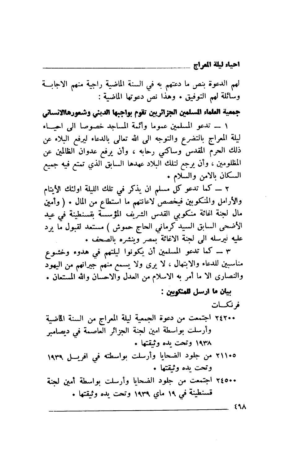 2 - كما تدعو كل مسلم أن يذكر في تلك الليلة أولئك الأيتام والأرامل والمنكوبين فيخصص لإعانتهم ما استطاع من المال. (وأمين مال لجنة إغاثة منكوبي القدس الشريف المؤسسة بقسنطينة في عيد الأضحى السابق السيد كرماني الحاج حموش) مستعد لقبول ما يرد عليه ليرسله إلى لجنة الإغاثة بمصر وينشره بالصحف.
