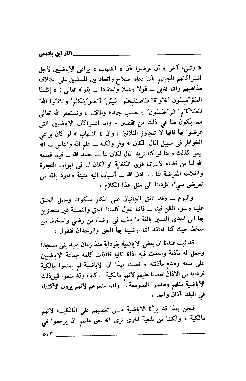 "وشيء آخر" أن عرضوا بأن "الشهاب" يراعي الإباضيين لأجل اشتراكاتهم فأجبتهم بأننا دعاة إصلاح واتحاد بين المسلمين على اختلاف مذاهبهم وإننا ندين- قولا وعملا واعتقادا- بقوله تعالى: {إِنَّمَا الْمُؤْمِنُونَ إِخْوَةٌ فَأَصْلِحُوا بَيْنَ أَخَوَيْكُمْ وَاتَّقُوا اللَّهَ لَعَلَّكُمْ تُرْحَمُونَ} حسب جهدنا وطاقتنا، ونستغفر الله تعالى مما يكون منا في ذلك من تقصير. وأما اشتراكات الإباضيين التي عرضوا بها فإنها لا تتجاوز الثلاثين، وأن "الشهاب" لو كان يراعي الخواطر في سبيل المال لكان له وفر ولكنه- علم الله والناس- أنه ليس كذلك وإننا لو كنا نريد المال لكان لنا- بحمد الله- فيما قسمه الله لنا من فضله لأسرتنا فوق الكفاية أو لكان لنا في أبواب التجارة والفلاحة المعرضة لنا- بإذن الله- أسباب إليه متينة ونعوذ بالله من تعريض سيِّء يؤدينا إلى مثل هذا الكلام.
