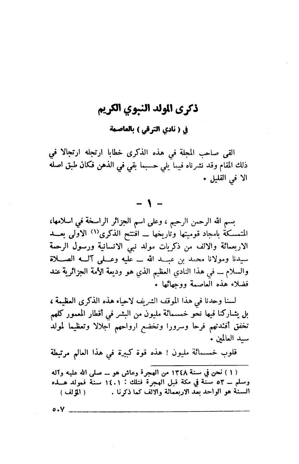 بسم الله الرحمن الرحيم، وعلى اسم الجزائر الراسخة في إسلامها، المتمسكة بأمجاد قوميتها وتاريخها- افتتح الذكرى (1) الأولى بعد الأربعمائة والألف من ذكريات مولد نبي الإنسانية ورسول الرحمة سيدنا ومولانا محمد بن عبد الله- عليه وعلى آله الصلاة والسلام- في هذا النادي العظيم الذي هو وديعة الأمة الجزائرية عند فضلاء هذه العاصمة ووجهائها.