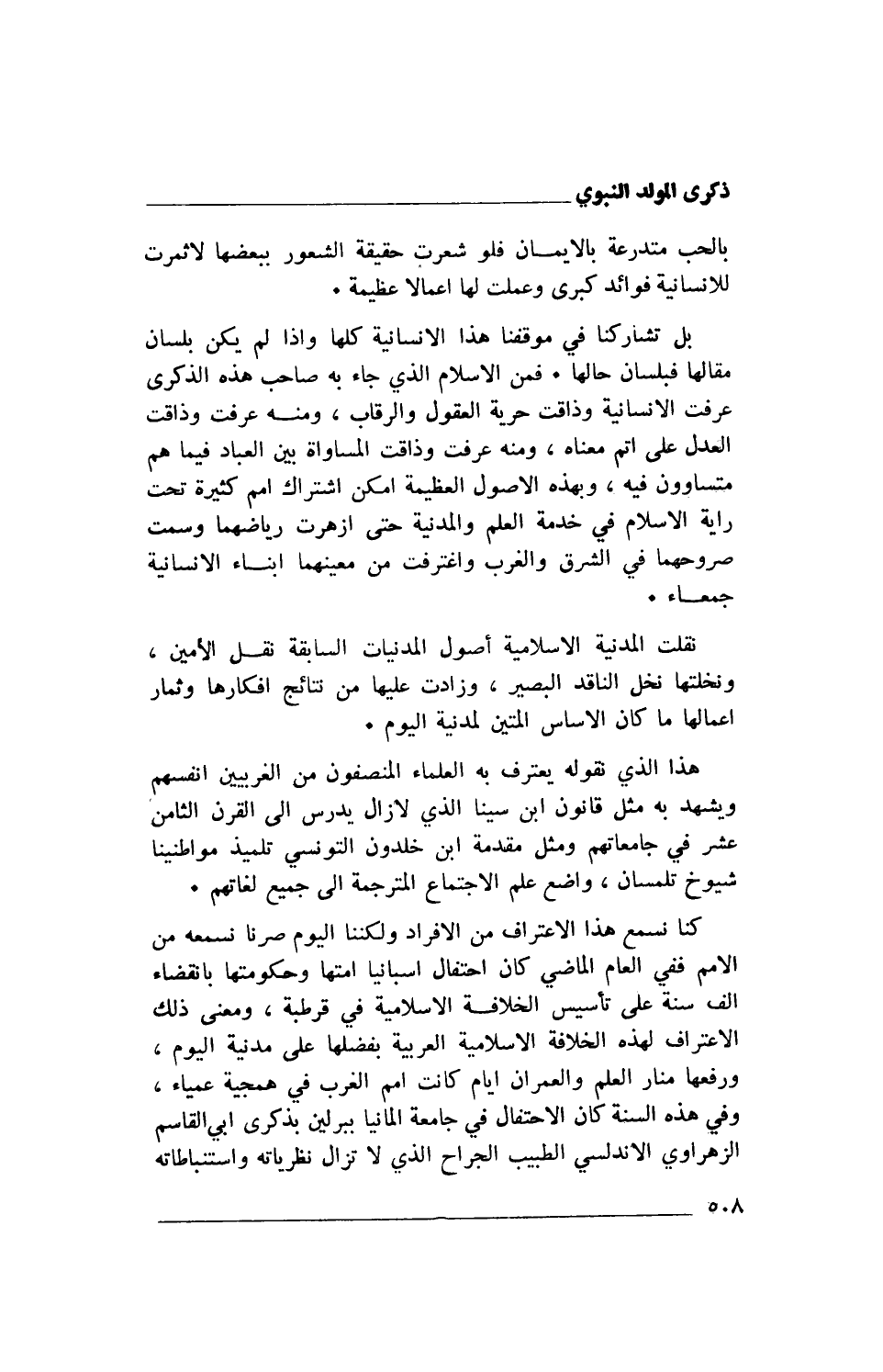 بل تشاركنا في موقفنا هذا الإنسانية كلها وإذا لم يكن بلسان مقالها فبلسان حالها. فمن الإسلام الذي جاء به صاحب هذه الذكرى عرفت الإنسانية وذاقت حرية العقول والرقاب، ومنه عرفت وذاقت العدل على أتم معناه، ومنه عرفت وذاقت المساواة بين العباد فيما هم متساوون فيه، وبهذه الأصول العظيمة أمكن اشتراك أمم كثيرة تحت راية الإسلام في خدمة العلم والمدنية حتى أزهرت رياضهما وسمت صروحهما في الشرق والغرب واغترفت من معينهما أبناء الإنسانية جمعاء.