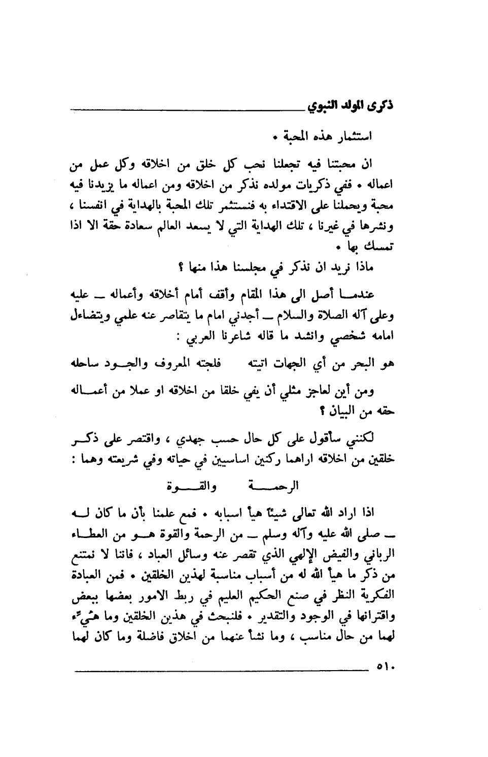 إن محبتنا فيه تجعلنا نحب كل خلق من أخلاقه وكل عمل من أعماله. ففي ذكريات مولده نذكر من أخلاقه ومن أعماله ما يزيدنا فيه محبة ويحملنا على الاقتداء به فنستثمر تلك المحبة بالهداية في أنفسنا، ونشرها في غيرنا، تلك الهداية التي لا يسعد العالم سعادة حقة إلا إذا تمسك بها.