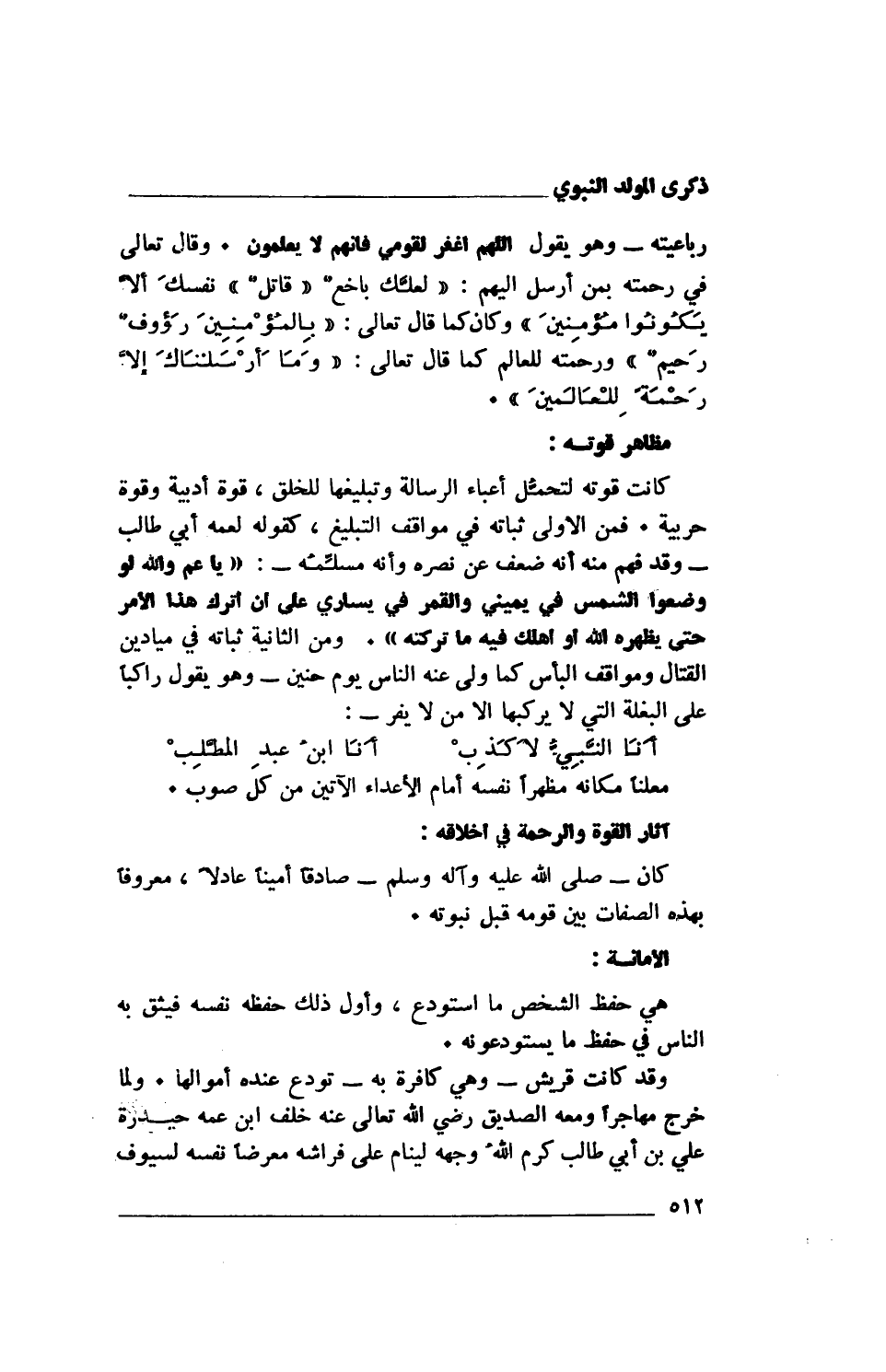 رباعيته- وهو يقول اللهم اغفر لقومي فإنهم لا يعلمون. وقال تعالى في رحمته بمن أرسل إليهم: {لَعَلَّكَ بَاخِعٌ "قاتل" نَفْسَكَ أَلَّا يَكُونُوا مُؤْمِنِينَ} وكان كما قال تعالى: {بِالْمُؤْمِنِينَ رَءُوفٌ رَحِيمٌ} ورحمته للعالم كما قال تعالى: {وَمَا أَرْسَلْنَاكَ إِلَّا رَحْمَةً لِلْعَالَمِينَ}.