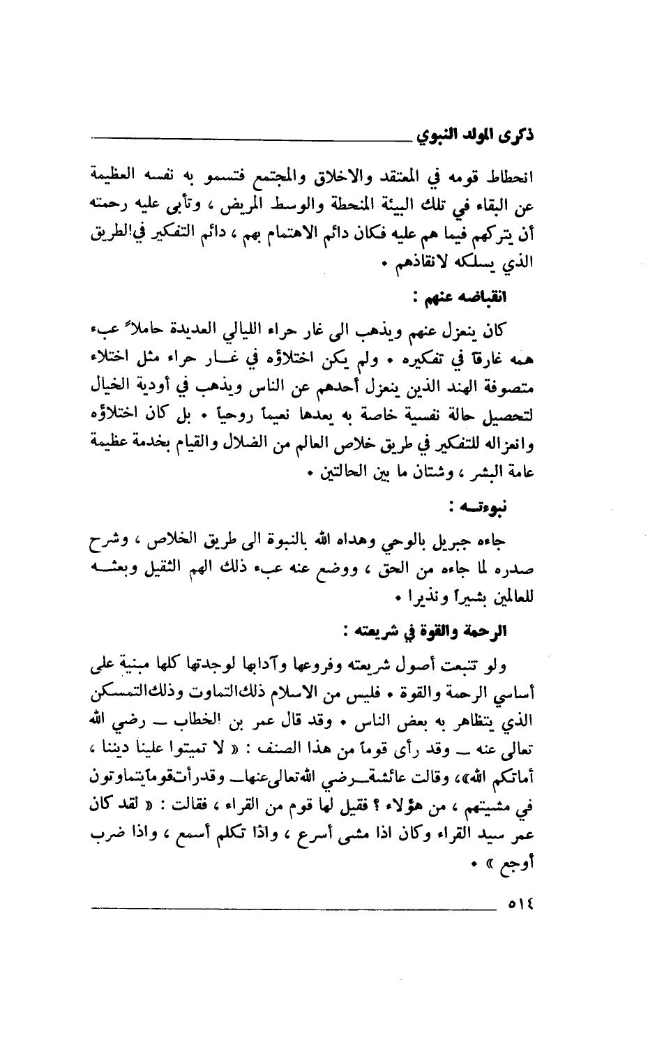 ولو تتبعت أصول شريعته وفروعها وآدابها لوجدتها كلها مبنية على أساسي الرحمة والقوة. فليس من الإسلام ذلك التماوت وذلك التمسكن الذي يتظاهر به بعض الناس. وقد قال عمر بن الخطاب- رضي الله تعالى عنه- وقد رأى قوما من هذا الصنف: "لا تميتوا علينا ديننا، أماتكم الله"، وقالت عائشة- رضي الله تعالى عنها- وقد رأت قوما يتماوتون في مشيتهم، من هؤلاء؟ فقيل لها قوم من القراء، فقالت: "لقد كان عمر سيد القراء وكان إذا مشى أسرع، وإذا تكلم أسمع، وإذا ضرب أوجع".