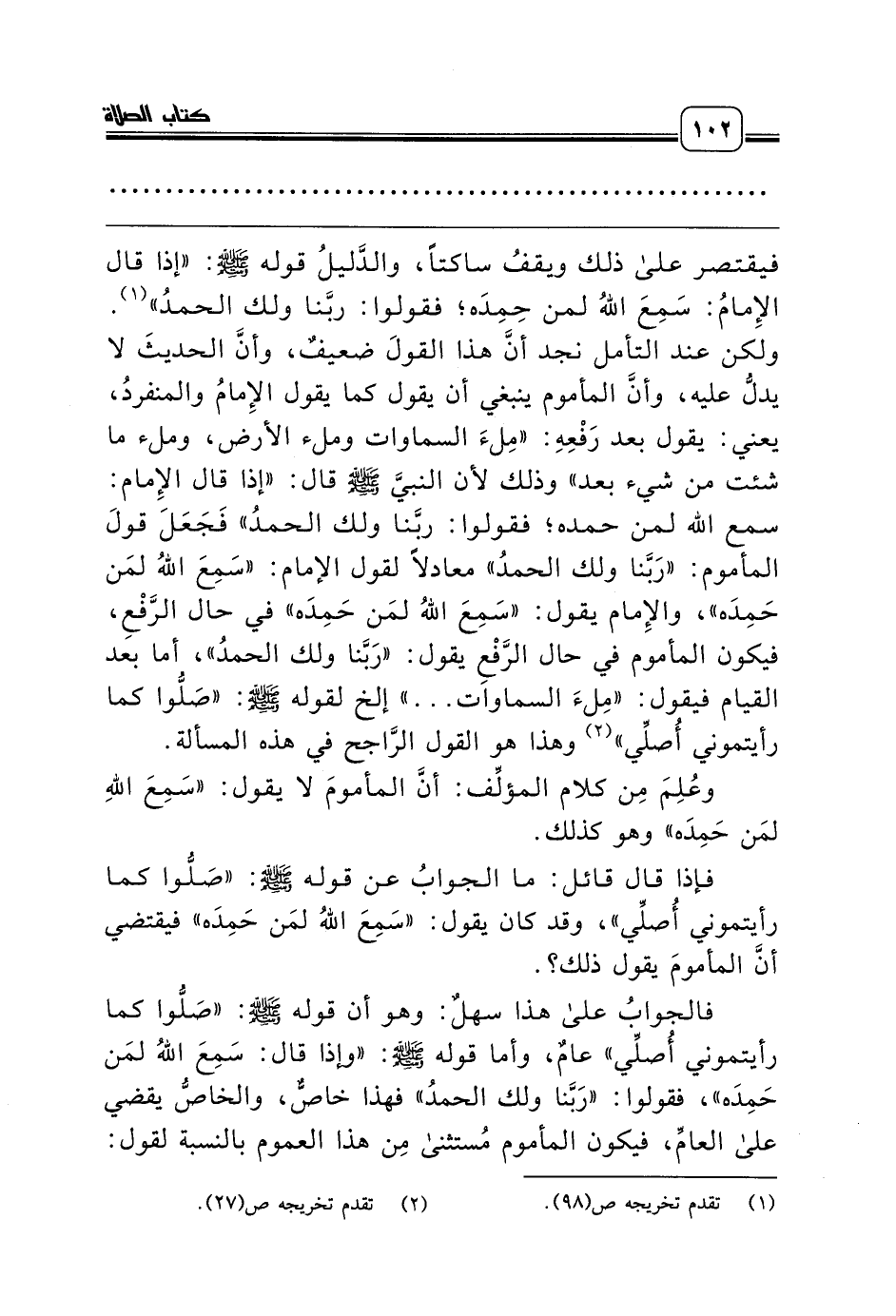 فيقتصر على ذلك ويقفُ ساكتاً، والدَّليلُ قوله صلّى الله عليه وسلّم: «إذا قال الإِمامُ: سَمِعَ اللهُ لمن حِمِدَه؛ فقولوا: ربَّنا ولك الحمدُ» (¬1). ولكن عند التأمل نجد أنَّ هذا القولَ ضعيفٌ، وأنَّ الحديثَ لا يدلُّ عليه، وأنَّ المأموم ينبغي أن يقول كما يقول الإِمامُ والمنفردُ، يعني: يقول بعد رَفْعِهِ: «مِلءَ السماوات وملء الأرض، وملء ما شئت من شيء بعد» وذلك لأن النبيَّ صلّى الله عليه وسلّم قال: «إذا قال الإِمام: سمع الله لمن حمده؛ فقولوا: ربَّنا ولك الحمدُ» فَجَعَلَ قولَ المأموم: «رَبَّنا ولك الحمدُ» معادلاً لقول الإمام: «سَمِعَ اللهُ لمَن حَمِدَه»، والإِمام يقول: «سَمِعَ اللهُ لمَن حَمِدَه» في حال الرَّفْعِ، فيكون المأموم في حال الرَّفْعِ يقول: «رَبَّنا ولك الحمدُ»، أما بعد القيام فيقول: «مِلءَ السماوات ... » إلخ لقوله صلّى الله عليه وسلّم: «صَلُّوا كما رأيتموني أُصلِّي» (¬2) وهذا هو القول الرَّاجح في هذه المسألة.