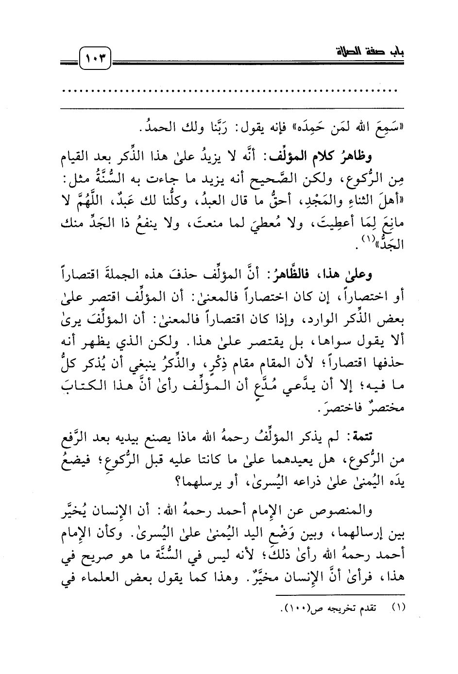 وظاهرُ كلام المؤلِّف: أنَّه لا يزيدُ على هذا الذِّكر بعد القيام مِن الرُّكوع، ولكن الصَّحيح أنه يزيد ما جاءت به السُّنَّةُ مثل: «أهلَ الثناءِ والمَجْدِ، أحقُّ ما قال العبدُ، وكلُّنا لك عَبدٌ، اللَّهُمَّ لا مانِعَ لِمَا أعطِيتَ، ولا مُعطيَ لما منعتَ، ولا ينفعُ ذا الجَدِّ منك الجَدُّ» (¬1).
