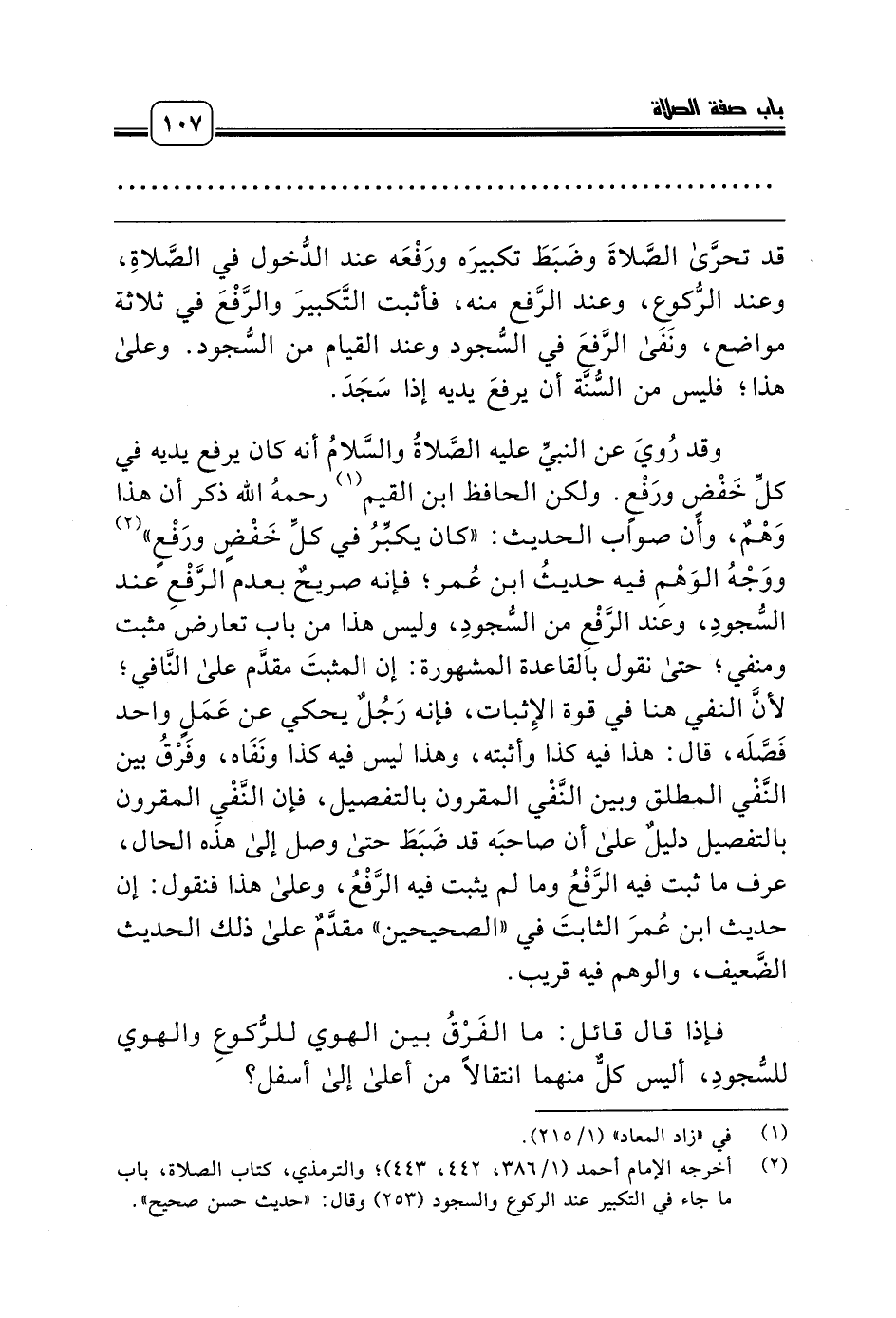 وقد رُويَ عن النبيِّ عليه الصَّلاةُ والسَّلامُ أنه كان يرفع يديه في كلِّ خَفْضٍ ورَفْعٍ. ولكن الحافظ ابن القيم (¬1) رحمه الله ذكر أن هذا وَهْمٌ، وأن صواب الحديث: «كان يكبِّرُ في كلِّ خَفْضٍ ورَفْعٍ» (¬2) ووَجْهُ الوَهْمِ فيه حديثُ ابن عُمر؛ فإنه صريحٌ بعدم الرَّفْعِ عند السُّجودِ، وعند الرَّفْعِ من السُّجودِ، وليس هذا من باب تعارض مثبت ومنفي؛ حتى نقول بالقاعدة المشهورة: إن المثبتَ مقدَّم على النَّافي؛ لأنَّ النفي هنا في قوة الإِثبات، فإنه رَجُلٌ يحكي عن عَمَلٍ واحد فَصَّلَه، قال: هذا فيه كذا وأثبته، وهذا ليس فيه كذا ونَفَاه، وفَرْقُ بين النَّفْي المطلق وبين النَّفْي المقرون بالتفصيل، فإن النَّفْيِ المقرون بالتفصيل دليلٌ على أن صاحبَه قد ضَبَطَ حتى وصل إلى هذه الحال، عرف ما ثبت فيه الرَّفْعُ وما لم يثبت فيه الرَّفْعُ، وعلى هذا فنقول: إن حديث ابن عُمرَ الثابتَ في «الصحيحين» مقدَّمٌ على ذلك الحديث الضَّعيف، والوهم فيه قريب.
