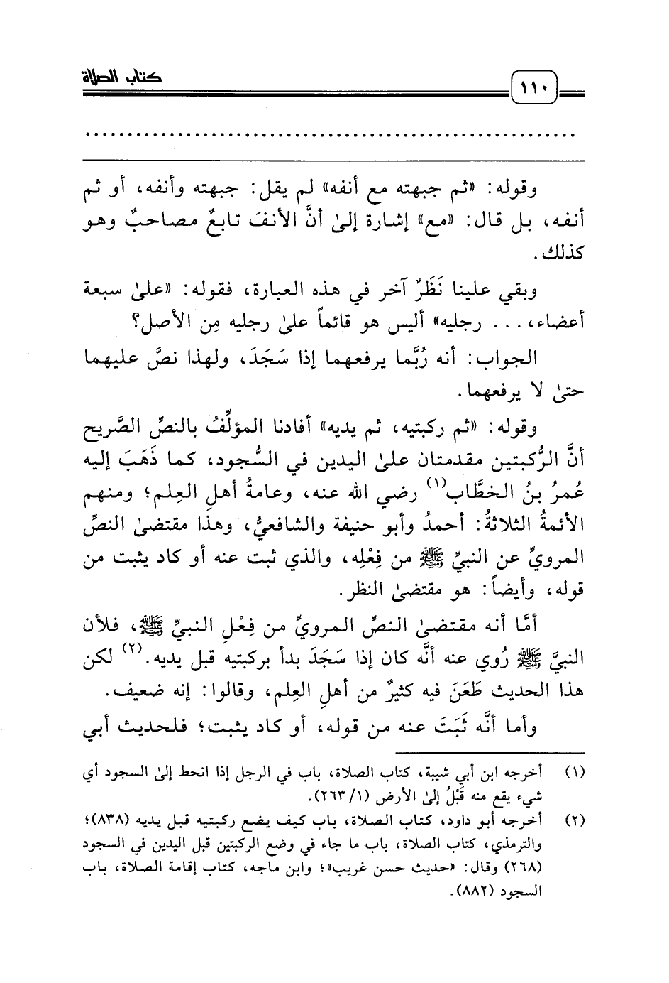 أمَّا أنه مقتضى النصِّ المرويِّ من فِعْلِ النبيِّ صلّى الله عليه وسلّم، فلأن النبيَّ صلّى الله عليه وسلّم رُوي عنه أنَّه كان إذا سَجَدَ بدأ بركبتيه قبل يديه. (¬2) لكن هذا الحديث طَعَنَ فيه كثيرٌ من أهلِ العِلم، وقالوا: إنه ضعيف.