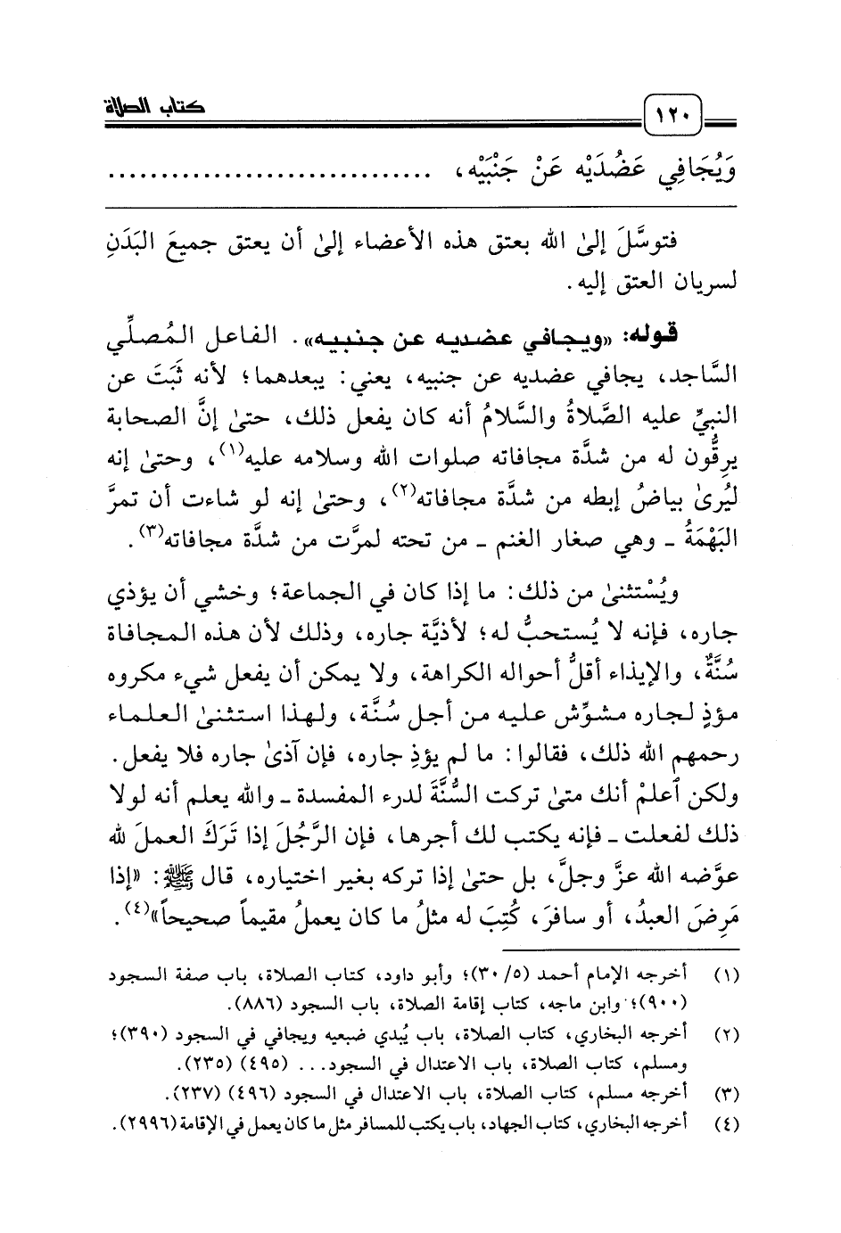 وَيُجَافِي عَضُدَيْه عَنْ جَنْبَيْه، وبَطْنهُ عَنْ فَخِذَيْهِ، وَيُفَرِّقُ رُكْبَتَيْهِ، ..........