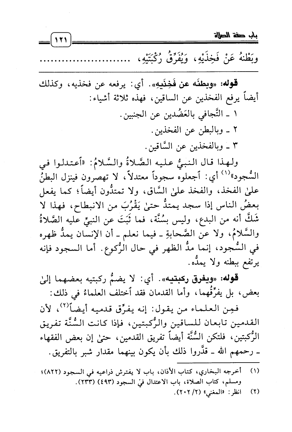 فمِن العلماء من يقول: إنه يفرِّق قدميه أيضاً (¬2)، لأن القدمين تابعان للساقين والرُّكبتين، فإذا كانت السُّنَّة تفريق الرُّكبتين، فلتكن السُّنَّة أيضاً تفريق القدمين، حتى إن بعض الفقهاء ـ رحمهم الله ـ قدَّروا ذلك بأن يكون بينهما مقدار شبر بالتفريق.