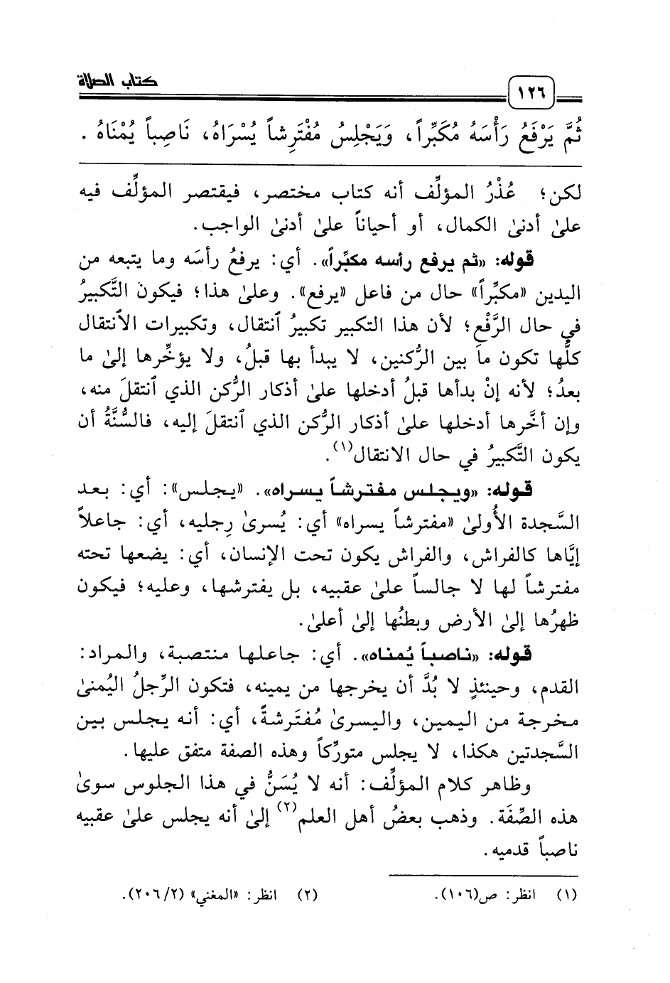 ثُمَّ يَرْفَعُ رَأْسَهُ مُكَبِّراً، وَيَجْلِسُ مُفْتَرِشاً يُسْرَاهُ، نَاصِباً يُمْنَاهُ .......