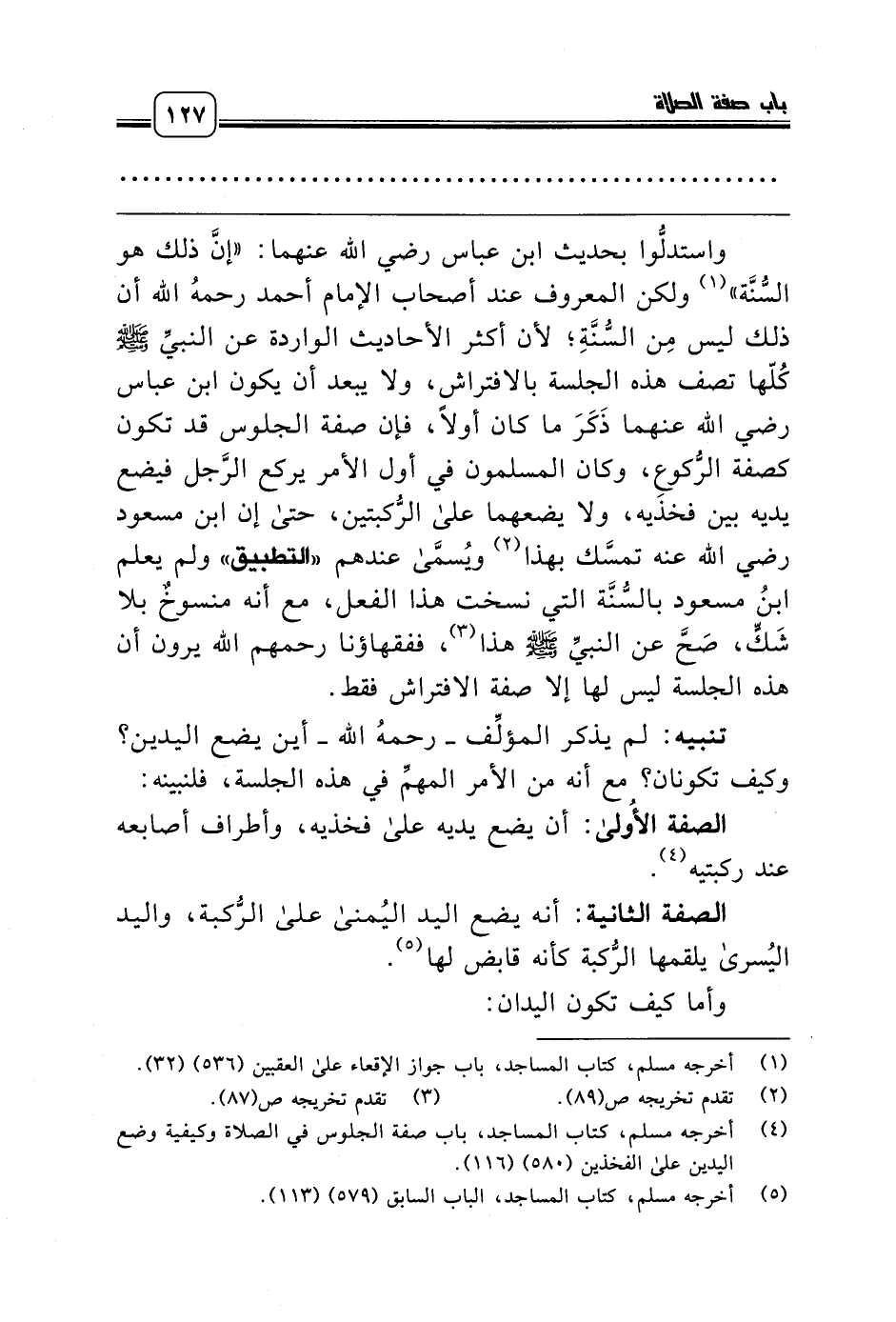 (¬4) أخرجه مسلم، كتاب المساجد، باب صفة الجلوس في الصلاة وكيفية وضع اليدين على الفخذين (580) (116).