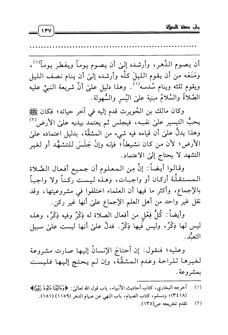 أن يصوم الدَّهر، وأرشده إلى أن يصوم يوماً ويفطر يوماً (¬1)، ومَنَعَه من أن يقوم الليلَ كلَّه وأرشده إلى أن ينام نصف الليل ويقوم ثلثه وينام سُدسه (267). وهذا دليل على أنَّ شريعة النبيِّ عليه الصَّلاةُ والسَّلامُ مبنية على اليُسرِ والسُّهولة.