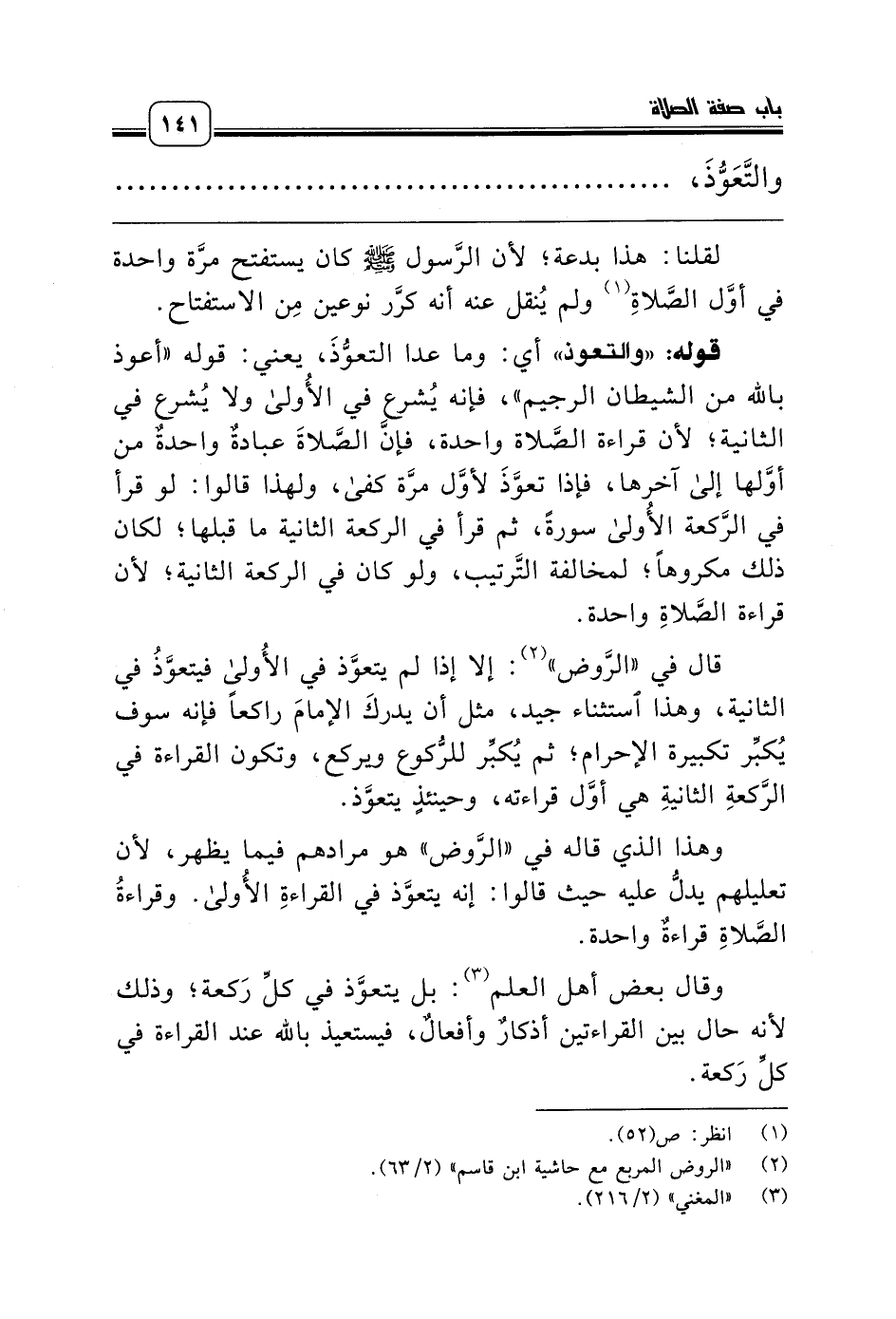 وهذا الذي قاله في «الرَّوض» هو مرادهم فيما يظهر، لأن تعليلهم يدلُّ عليه حيث قالوا: إنه يتعوَّذ في القراءةِ الأُولى. وقراءةُ الصَّلاةِ قراءةٌ واحدة.