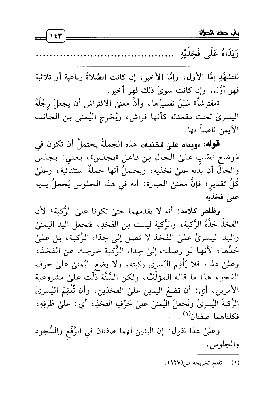 قوله: «ويداه على فخذيه» هذه الجملةُ يحتملُ أن تكون في مَوضعِ نَصْبٍ على الحال مِن فاعل «يجلس»، يعني: يجلس والحالُ أن يديه على فخذيه، ويحتملُ أنها جملةٌ استثنائية، وعلى كُلِّ تقديرٍ؛ فإنَّ معنى العبارة: أنه في هذا الجلوس يَجعلُ يديه على فخذيه.