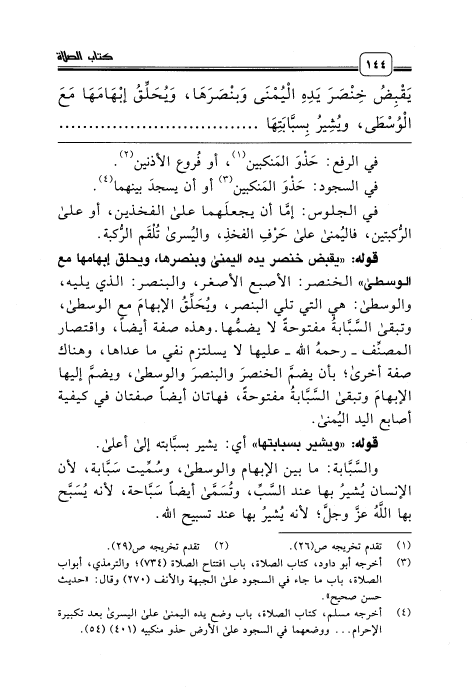 (¬4) أخرجه مسلم، كتاب الصلاة، باب وضع يده اليمنى على اليسرى بعد تكبيرة الإحرام ... ووضعهما في السجود على الأرض حذو منكبيه (401) (54).