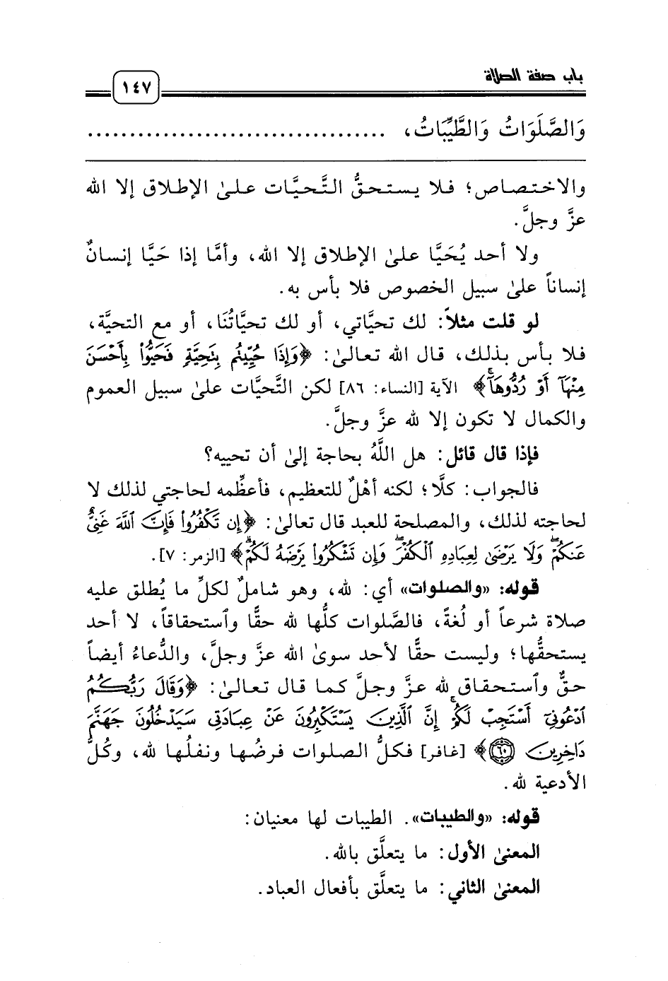 قوله: «والصلوات» أي: لله، وهو شاملٌ لكلِّ ما يُطلق عليه صلاة شرعاً أو لُغةً، فالصَّلوات كلُّها لله حقًّا واستحقاقاً، لا أحد يستحقُّها؛ وليست حقًّا لأحد سوى الله عزّ وجل، والدُّعاءُ أيضاً حقٌّ واستحقاق لله عزّ وجل كما قال تعالى: {وَقَالَ رَبُّكُمُ ادْعُونِي أَسْتَجِبْ لَكُمْ إِنَّ الَّذِينَ يَسْتَكْبِرُونَ عَنْ عِبَادَتِي سَيَدْخُلُونَ جَهَنَّمَ دَاخِرِينَ *} [غافر] فكلُّ الصلوات فرضُها ونفلُها لله، وكُلُّ الأدعية لله.