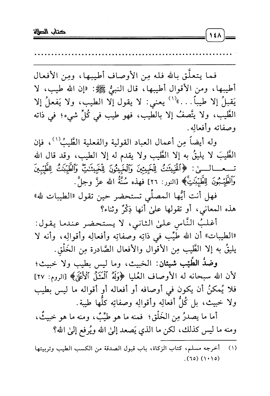 أغلبُ النَّاسِ على الثاني، لا يستحضر عندما يقول: «الطيبات» أن الله طيِّب في ذاتِه وصفاتِه وأفعالِه وأقوالِه، وأنه لا يليقُ به إلا الطَّيب مِن الأقوال والأفعال الصَّادرة مِن الخَلْقِ.