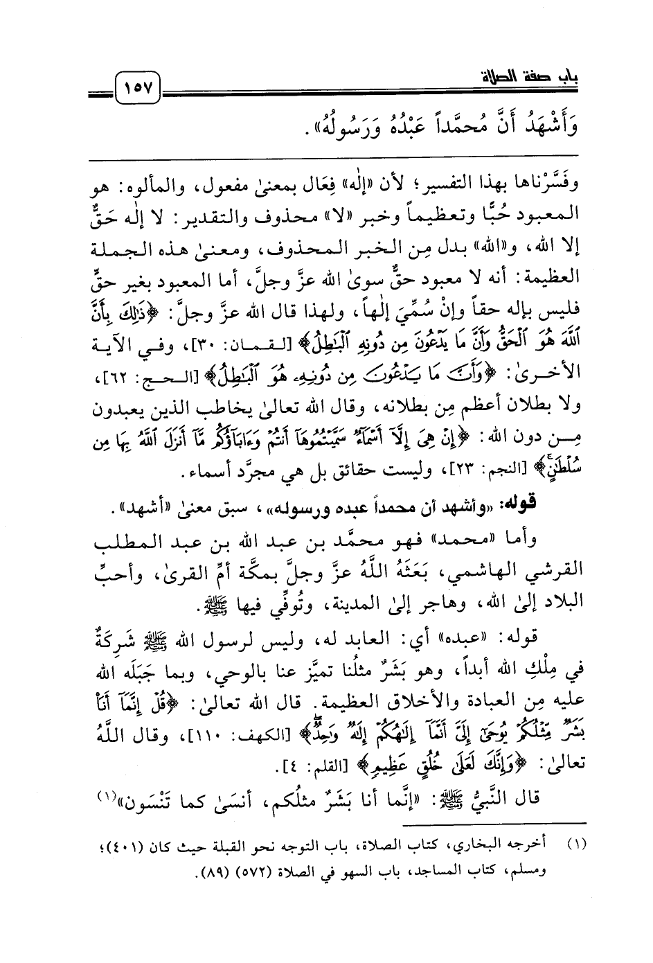 قوله: «عبده» أي: العابد له، وليس لرسول الله صلّى الله عليه وسلّم شَرِكَةٌ في مِلْكِ الله أبداً، وهو بَشَرٌ مثلُنا تميَّز عنا بالوحي، وبما جَبَلَه الله عليه مِن العبادة والأخلاق العظيمة. قال الله تعالى: {قُلْ إِنَّمَا أَنَا بَشَرٌ مِثْلُكُمْ يُوحَى إِلَيَّ أَنَّمَا إِلَهُكُمْ إِلَهٌ وَاحِدٌ} [الكهف: 110]، وقال اللَّهُ تعالى: {} [القلم: 4].
