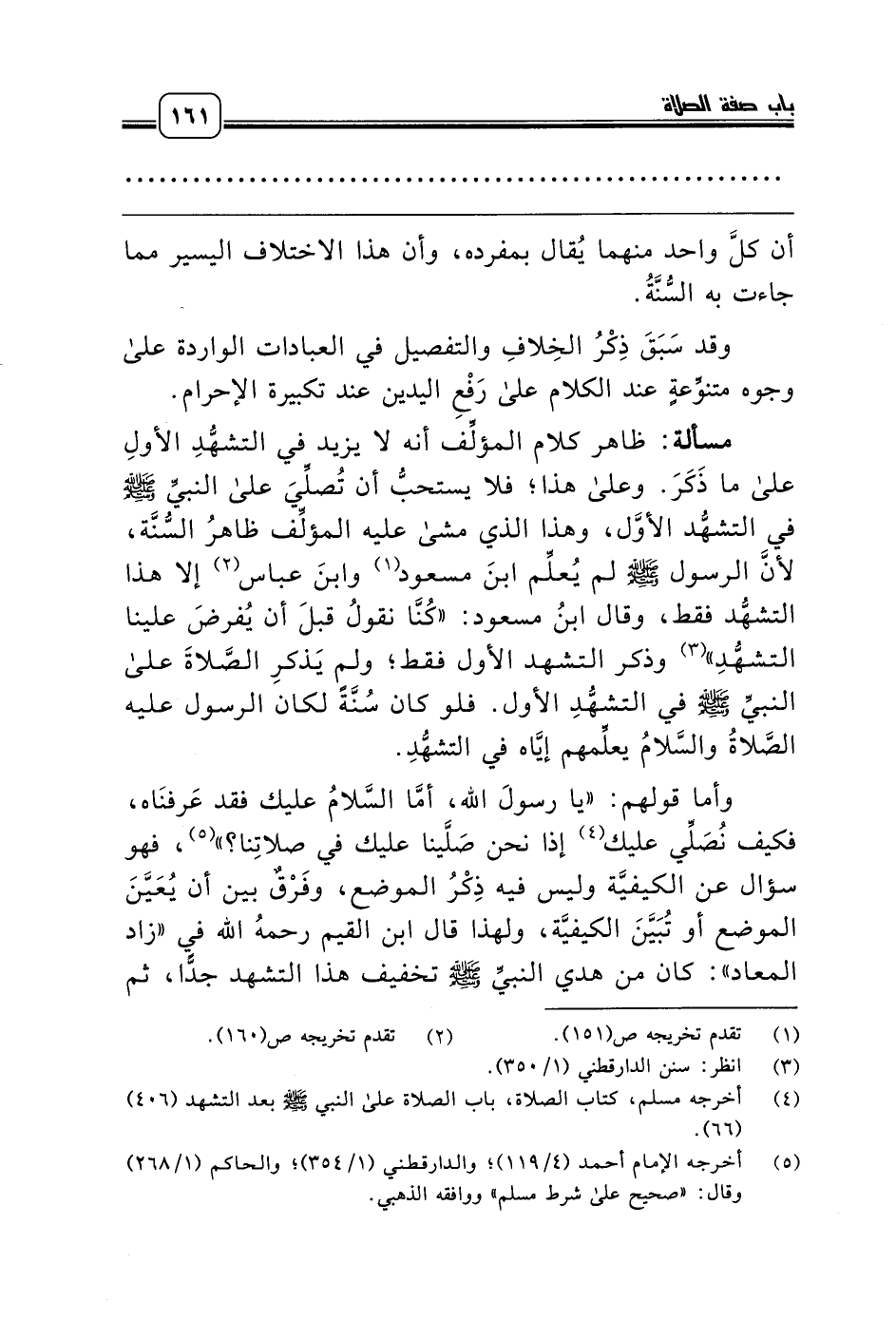 وأما قولهم: «يا رسولَ الله، أمَّا السَّلامُ عليك فقد عَرفنَاه، فكيف نُصَلِّي عليك (¬4) إذا نحن صَلَّينا عليك في صلاتِنا؟» (¬5)، فهو سؤال عن الكيفيَّة وليس فيه ذِكْرُ الموضع، وفَرْقٌ بين أن يُعَيَّنَ الموضع أو تُبَيَّنَ الكيفيَّة، ولهذا قال ابن القيم رحمه الله في «زاد المعاد»: كان من هدي النبيِّ صلّى الله عليه وسلّم تخفيف هذا التشهد جدًّا، ثم