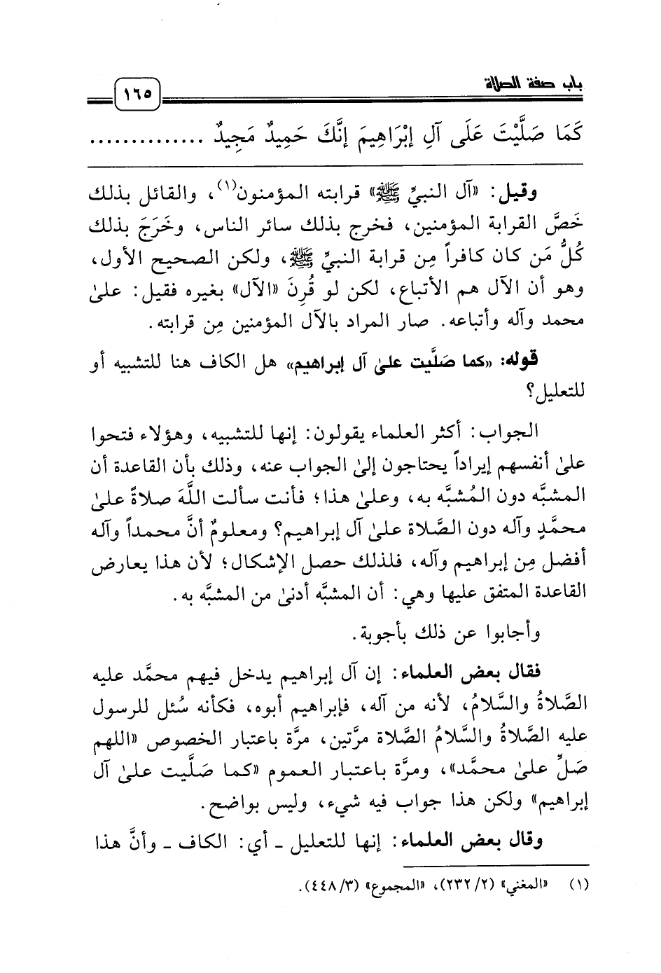 الجواب: أكثر العلماء يقولون: إنها للتشبيه، وهؤلاء فتحوا على أنفسهم إيراداً يحتاجون إلى الجواب عنه، وذلك بأن القاعدة أن المشبَّه دون المُشبَّه به، وعلى هذا؛ فأنت سألت اللَّهَ صلاةً على محمَّدٍ وآله دون الصَّلاة على آل إبراهيم؟ ومعلومٌ أنَّ محمداً وآله أفضل مِن إبراهيم وآله، فلذلك حصل الإشكال؛ لأن هذا يعارض القاعدة المتفق عليها وهي: أن المشبَّه أدنى من المشبَّه به.