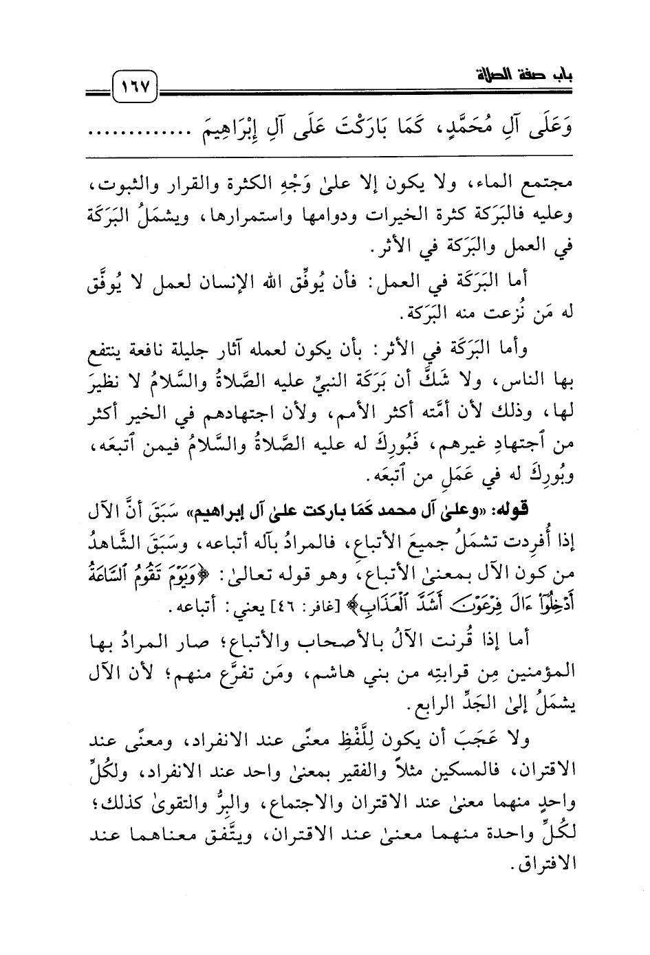 قوله: «وعلى آل محمد كَمَا باركت على آل إبراهيم» سَبَقَ أنَّ الآل إذا أُفرِدت تشمَلُ جميعَ الأتباعِ، فالمرادُ بآله أتباعه، وسَبَقَ الشَّاهدُ من كون الآل بمعنى الأتباع، وهو قوله تعالى: {وَيَوْمَ تَقُومُ السَّاعَةُ أَدْخِلُوا آلَ فِرْعَوْنَ أَشَدَّ الْعَذَابِ} [غافر: 46] يعني: أتباعه.