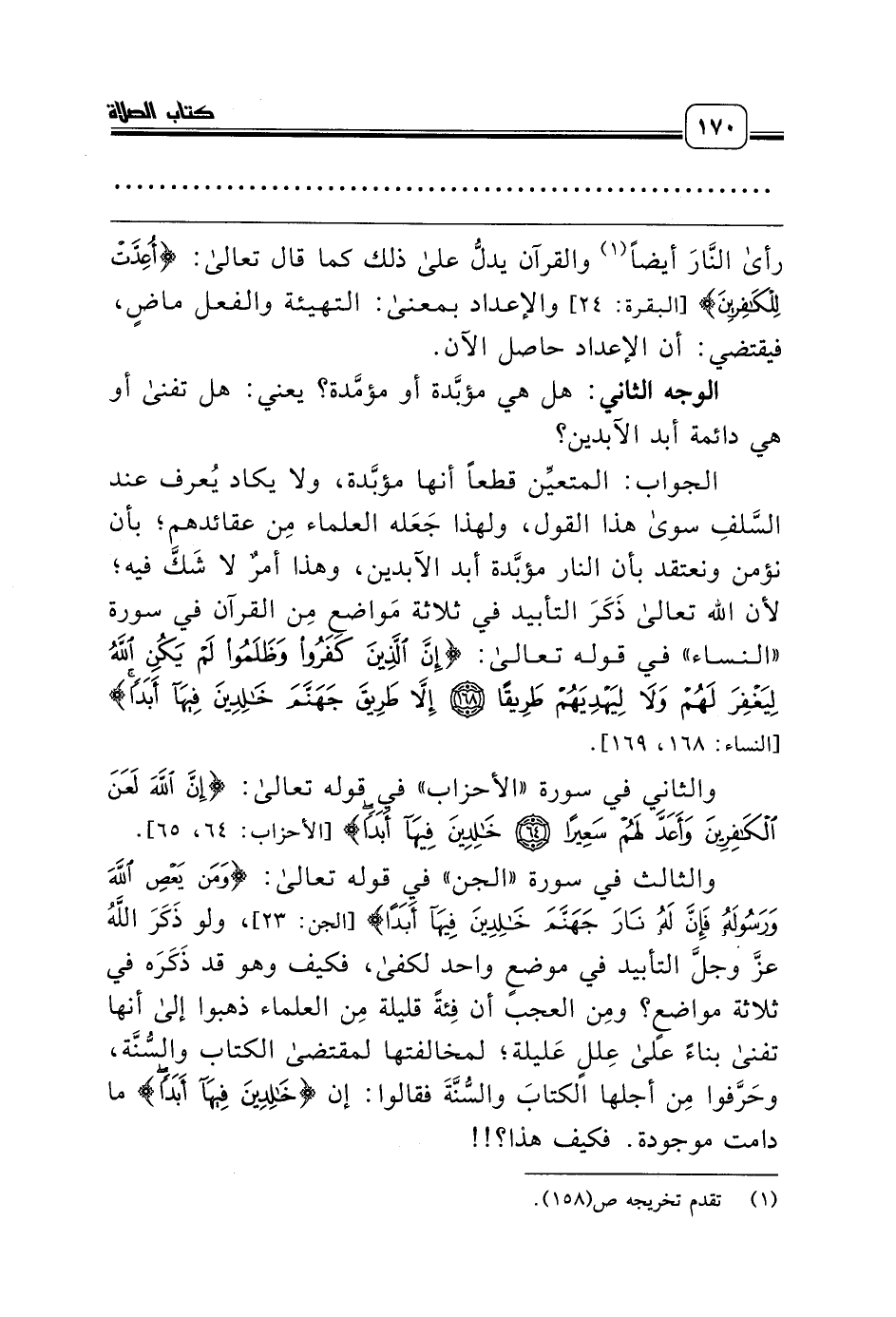 الجواب: المتعيِّن قطعاً أنها مؤبَّدة، ولا يكاد يُعرف عند السَّلفِ سوى هذا القول، ولهذا جَعَله العلماء مِن عقائدهم؛ بأن نؤمن ونعتقد بأن النار مؤبَّدة أبد الآبدين، وهذا أمرٌ لا شَكَّ فيه؛ لأن الله تعالى ذَكَرَ التأبيد في ثلاثة مَواضع مِن القرآن في سورة «النساء» في قوله تعالى: {إِنَّ الَّذِينَ كَفَرُوا وَظَلَمُوا لَمْ يَكُنِ اللَّهُ لِيَغْفِرَ لَهُمْ وَلاَ لِيَهْدِيَهُمْ طَرِيقًا *} {إِلاَّ طَرِيقَ جَهَنَّمَ خَالِدِينَ فِيهَا أَبَدًا} [النساء: 168، 169].