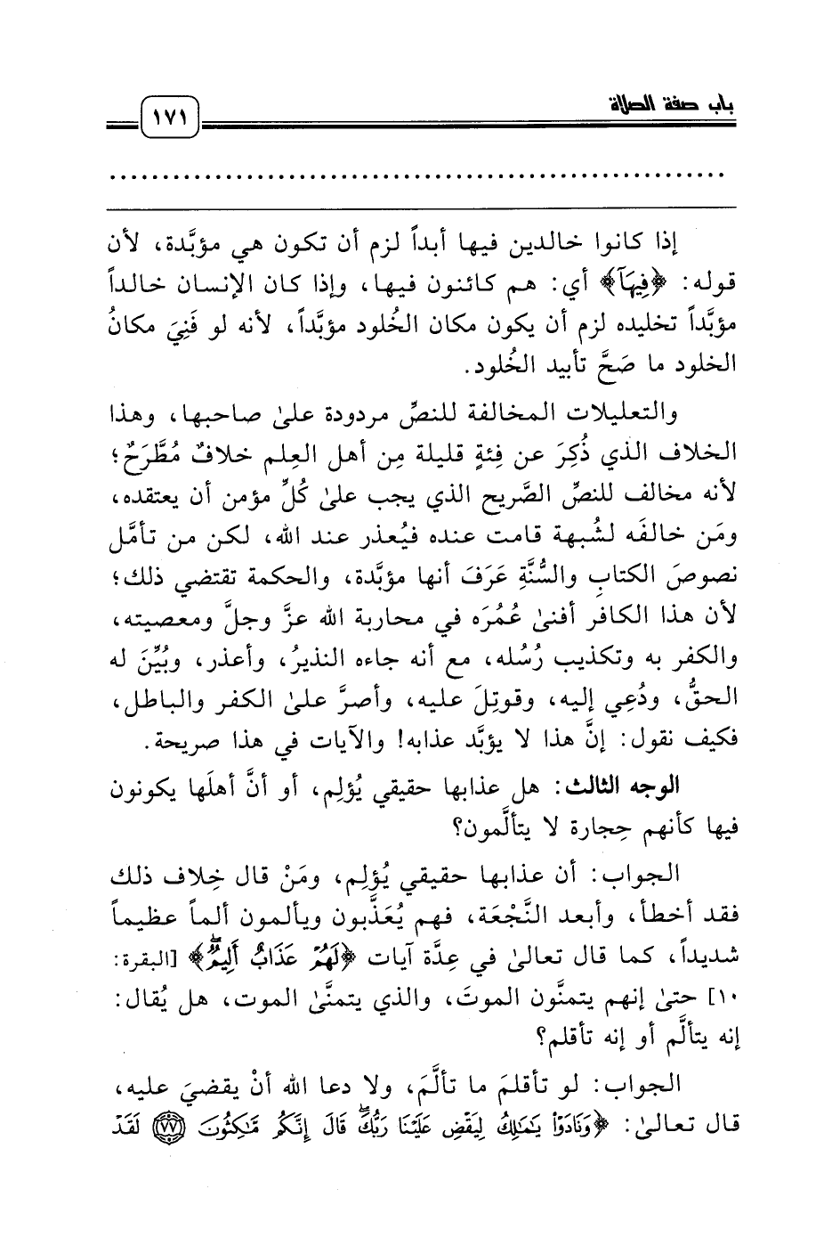 والتعليلات المخالفة للنصِّ مردودة على صاحبها، وهذا الخلاف الذي ذُكِرَ عن فِئةٍ قليلة مِن أهل العِلم خلافٌ مُطَّرَحٌ؛ لأنه مخالف للنصِّ الصَّريح الذي يجب على كُلِّ مؤمن أن يعتقده، ومَن خالفَه لشُبهة قامت عنده فيُعذر عند الله، لكن من تأمَّل نصوصَ الكتابِ والسُّنَّةِ عَرَفَ أنها مؤبَّدة، والحكمة تقتضي ذلك؛ لأن هذا الكافر أفنى عُمُرَه في محاربة الله عزّ وجل ومعصيته، والكفر به وتكذيب رُسُله، مع أنه جاءه النذيرُ، وأعذر، وبُيِّنَ له الحقُّ، ودُعِي إليه، وقوتِلَ عليه، وأصرَّ على الكفر والباطل، فكيف نقول: إنَّ هذا لا يؤبَّد عذابه! والآيات في هذا صريحة.