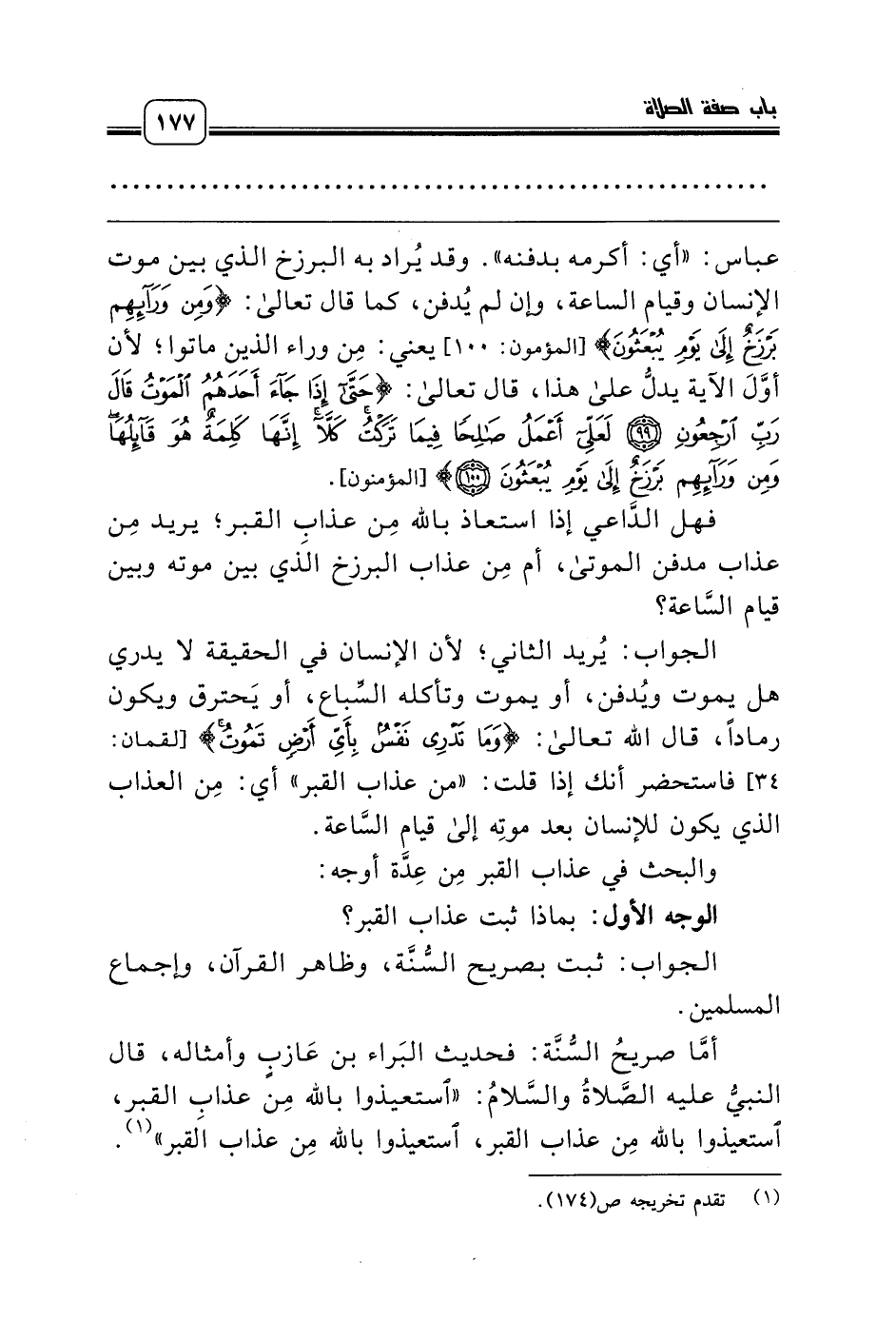 فهل الدَّاعي إذا استعاذ بالله مِن عذابِ القبر؛ يريد مِن عذاب مدفن الموتى، أم مِن عذاب البرزخ الذي بين موته وبين قيام السَّاعة؟
