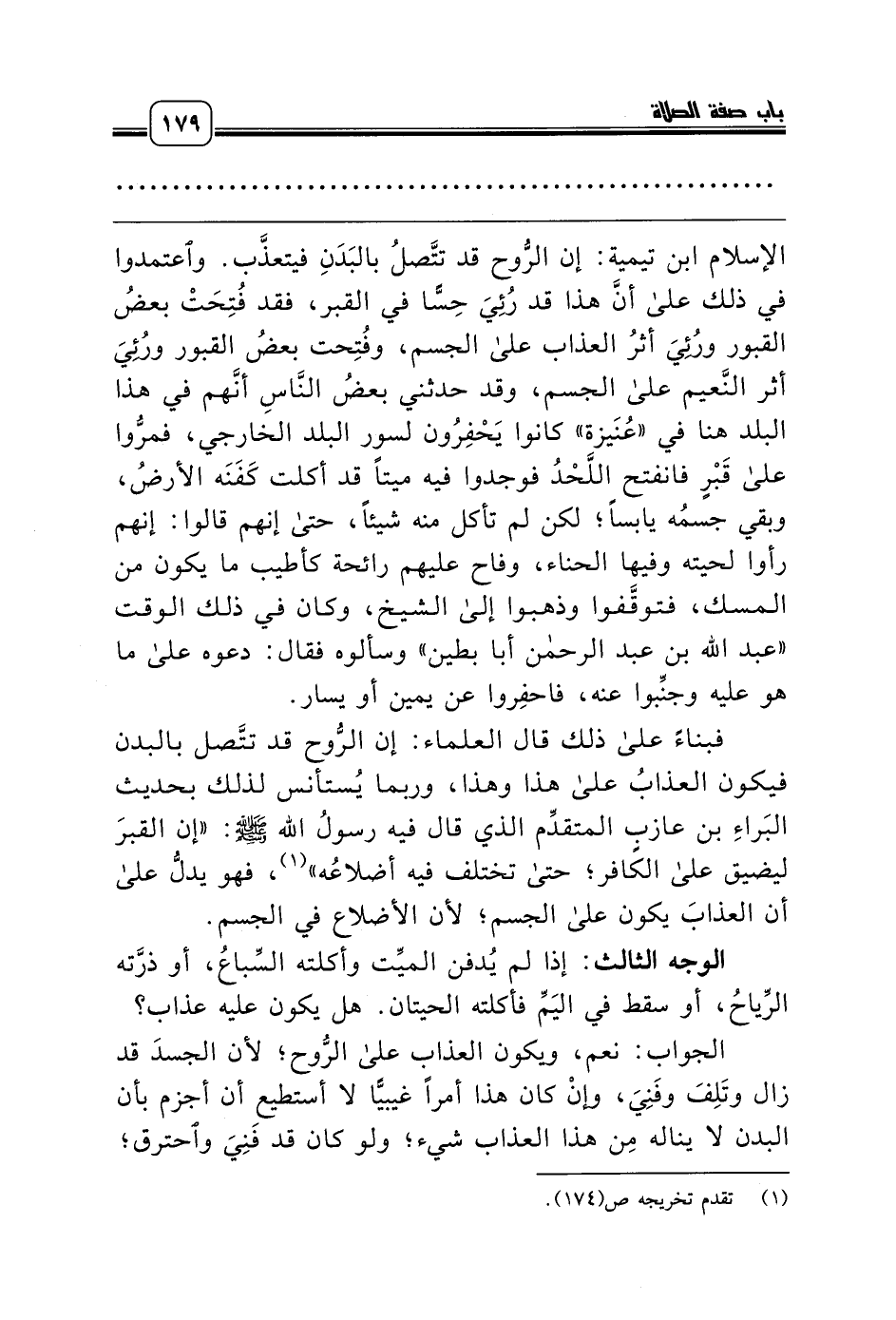 الإسلام ابن تيمية: إن الرُّوح قد تتَّصلُ بالبَدَنِ فيتعذَّب. واعتمدوا في ذلك على أنَّ هذا قد رُئِيَ حِسًّا في القبر، فقد فُتِحَتْ بعضُ القبور ورُئِيَ أثرُ العذاب على الجسم، وفُتِحت بعضُ القبور ورُئِيَ أثر النَّعيم على الجسم، وقد حدثني بعضُ النَّاسِ أنَّهم في هذا البلد هنا في «عُنَيزة» كانوا يَحْفِرُون لسور البلد الخارجي، فمرُّوا على قَبْرٍ فانفتح اللَّحْدُ فوجدوا فيه ميتاً قد أكلت كَفَنَه الأرضُ، وبقي جسمُه يابساً؛ لكن لم تأكل منه شيئاً، حتى إنهم قالوا: إنهم رأوا لحيته وفيها الحناء، وفاح عليهم رائحة كأطيب ما يكون من المسك، فتوقَّفوا وذهبوا إلى الشيخ، وكان في ذلك الوقت «عبد الله بن عبد الرحمن أبا بطين» وسألوه فقال: دعوه على ما هو عليه وجنِّبوا عنه، فاحفِروا عن يمين أو يسار.