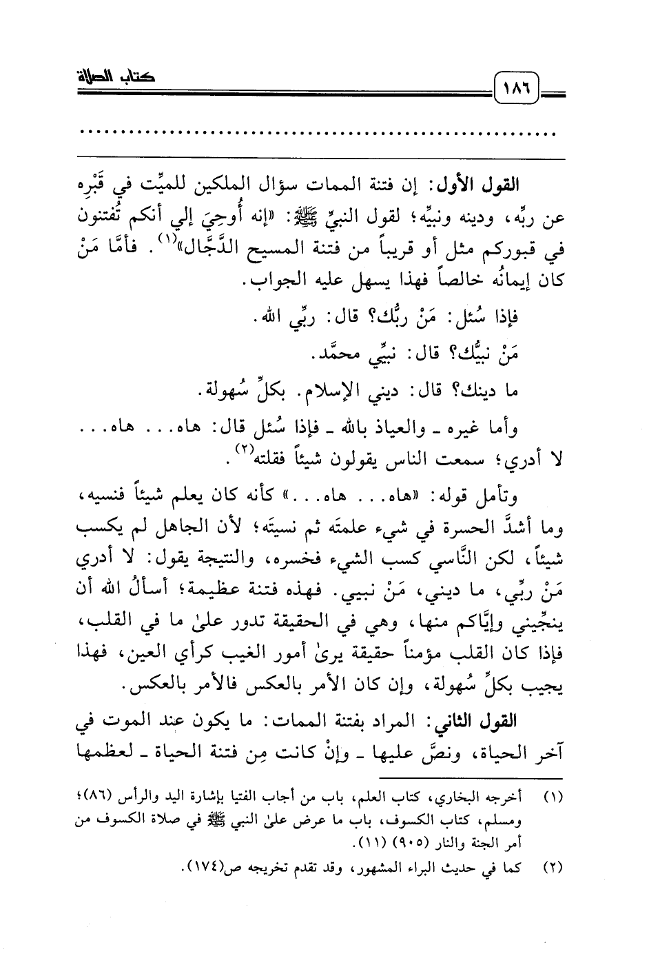 القول الأول: إن فتنة الممات سؤال الملكين للميِّت في قَبْرِه عن ربِّه، ودينه ونبيِّه؛ لقول النبيِّ صلّى الله عليه وسلّم: «إنه أُوحِيَ إلي أنكم تُفتنون في قبوركم مثل أو قريباً من فتنة المسيح الدَّجَّال» (¬1). فأمَّا مَنْ كان إيمانُه خالصاً فهذا يسهل عليه الجواب.