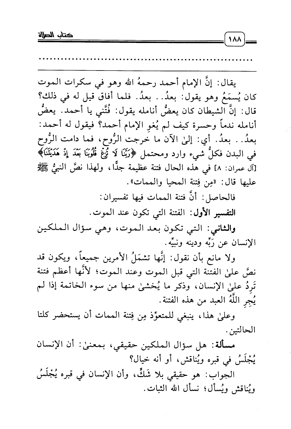يقال: إنَّ الإمام أحمد رحمه الله وهو في سكرات الموت كان يُسمَعُ وهو يقول: بعدُ .. بعدُ. فلما أفاق قيل له في ذلك؟ قال: إنَّ الشيطان كان يعضُّ أنامله يقول: فُتَّني يا أحمد. يعضُّ أنامله ندماً وحسرة كيف لم يُغوِ الإمام أحمد؟ فيقول له أحمد: بعدُ .. بعدُ. أي: إلى الآن ما خرجت الرُّوح، فما دامت الرُّوح في البدن فكلُّ شيء وارد ومحتمل {رَبَّنَا لاَ تُزِغْ قُلُوبَنَا بَعْدَ إِذْ هَدَيْتَنَا} [آل عمران: 8] في هذه الحال فتنة عظيمة جدًّا، ولهذا نصَّ النبيُّ صلّى الله عليه وسلّم عليها قال: «مِن فِتنة المحيا والممات».