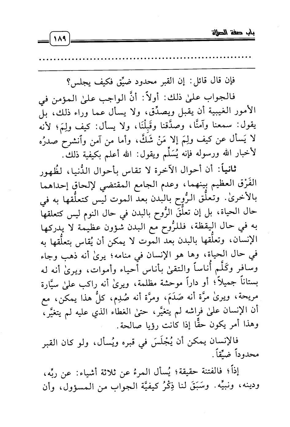 ثانياً: أن أحوال الآخرة لا تقاس بأحوال الدُّنيا، لظُهور الفَرْق العظيم بينهما، وعدم الجامع المقتضي لإلحاق إحداهما بالأخرى. وتعلُّق الرُّوح بالبدن بعد الموت ليس كتعلُّقها به في حال الحياة، بل إن تعلُّقَ الرُّوح بالبدن في حال النوم ليس كتعلقها به في حال اليقظة، فللرُّوح مع البدن شؤون عظيمة لا يدركها الإنسان، وتعلُّقها بالبدن بعد الموت لا يمكن أن يُقاس بتعلُّقها به في حال الحياة، وها هو الإنسان في منامه؛ يرى أنه ذهب وجاء وسافر وكَلَّم أُناساً والتقى بأناس أحياء وأموات، ويرى أنه له بستاناً جميلاً؛ أو داراً موحشة مظلمة، ويرى أنه راكب على سيَّارة مريحة، ويرى مرَّة أنه صَدَمَ، ومرَّة أنه صُدِم، كلُّ هذا يمكن، مع أن الإنسان على فراشه لم يتغيَّر، حتى الغطاء الذي عليه لم يتغيَّر، وهذا أمر يكون حقًّا إذا كانت رؤيا صالحة.