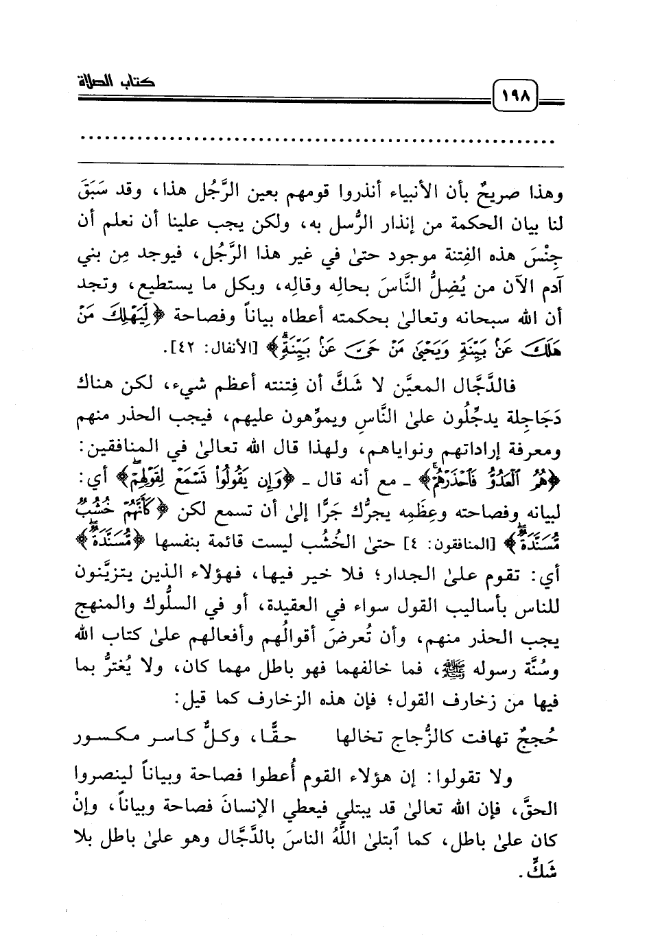 فالدَّجَّال المعيَّن لا شَكَّ أن فِتنته أعظم شيء، لكن هناك دَجَاجِلة يدجِّلُون على النَّاسِ ويموِّهون عليهم، فيجب الحذر منهم ومعرفة إراداتهم ونواياهم، ولهذا قال الله تعالى في المنافقين: {هُمُ الْعَدُوُّ فَاحْذَرْهُمْ} ـ مع أنه قال ـ {وَإِنْ يَقُولُوا تَسْمَعْ لِقَوْلِهِمْ} أي: لبيانه وفصاحته وعِظَمِه يجرُّك جَرًّا إلى أن تسمع لكن {كَأَنَّهُمْ خُشُبٌ مُسَنَّدَةٌ} [المنافقون: 4] حتى الخُشُب ليست قائمة بنفسها {مُسَنَّدَةٌ} أي: تقوم على الجدار؛ فلا خير فيها، فهؤلاء الذين يتزيَّنون للناس بأساليب القول سواء في العقيدة، أو في السلُّوك والمنهج يجب الحذر منهم، وأن تُعرضَ أقوالُهم وأفعالهم على كتاب الله وسُنَّة رسوله صلّى الله عليه وسلّم، فما خالفهما فهو باطل مهما كان، ولا يُغترُّ بما فيها من زخارف القول؛ فإن هذه الزخارف كما قيل: