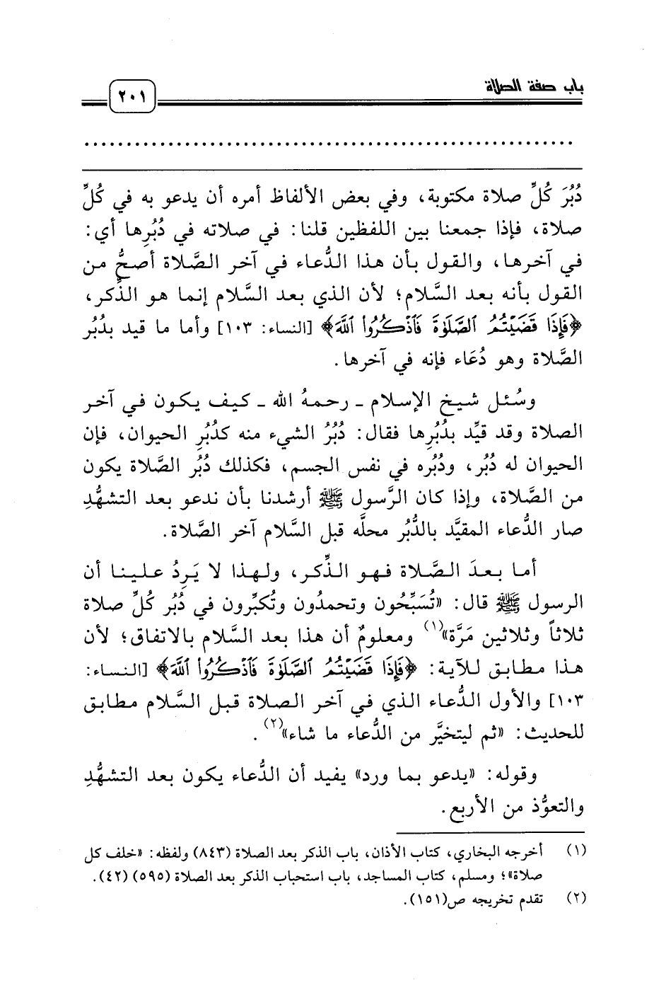 وسُئل شيخ الإسلام ـ رحمه الله ـ كيف يكون في آخر الصلاة وقد قيِّد بدُبُرِها فقال: دُبُرُ الشيء منه كدُبُرِ الحيوان، فإن الحيوان له دُبُر، ودُبُره في نفس الجسم، فكذلك دُبُر الصَّلاة يكون من الصَّلاة، وإذا كان الرَّسول صلّى الله عليه وسلّم أرشدنا بأن ندعو بعد التشهُّدِ صار الدُّعاء المقيَّد بالدُّبُر محلَّه قبل السَّلام آخر الصَّلاة.